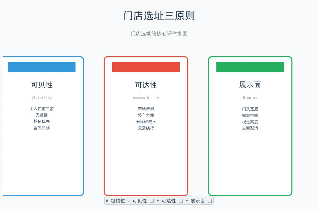 1. 可见性:主入口前三家、无遮挡、拐角优先2. 可达性:多公交直达、停车便利3. 展示面:门头宽度、橱窗展示、夜间照明