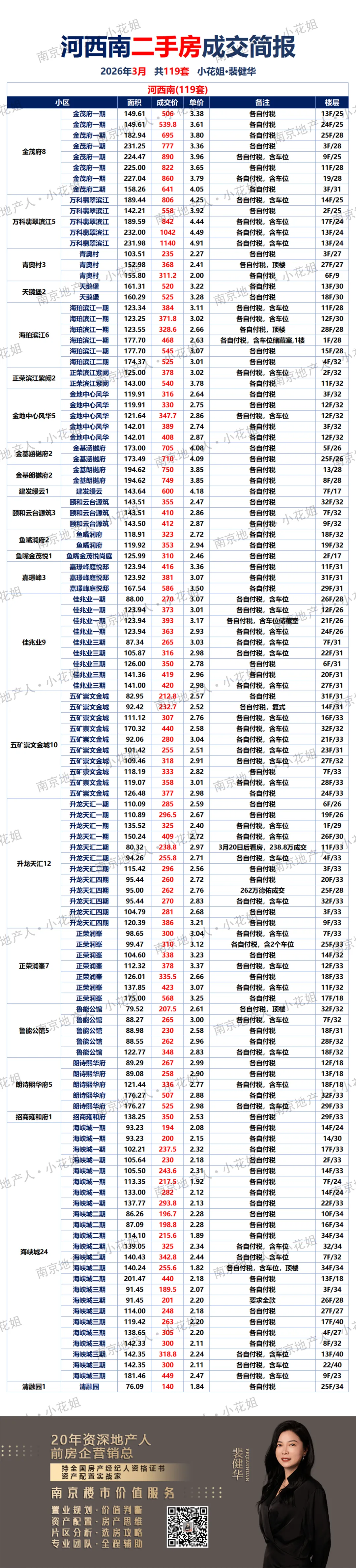 3月河西南119套成交落地,刚需刚改扛大旗, 300万以内成交占比超70%,仅万科翡翠滨江1套破千万,反映河西南仍以“刚需刚改”为成交基底,改善型需求以“稳健置换”为主,未出现大规模爆发。