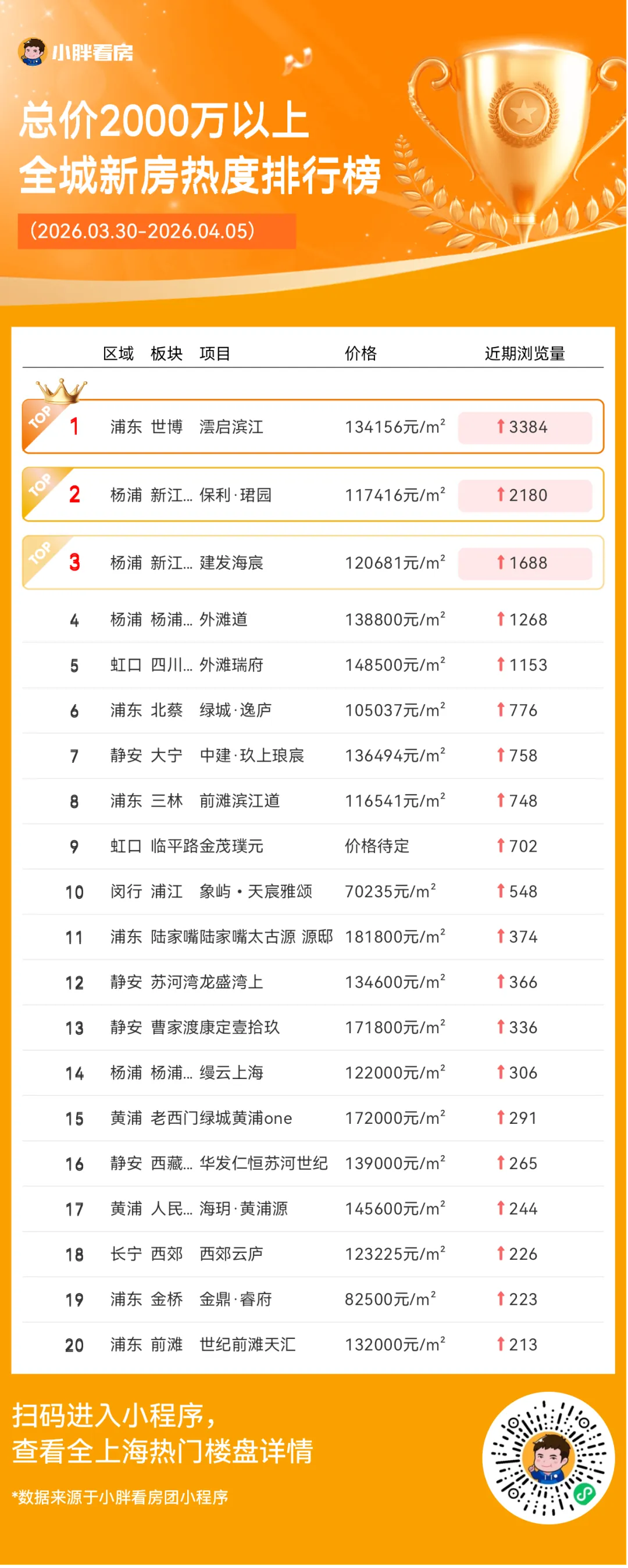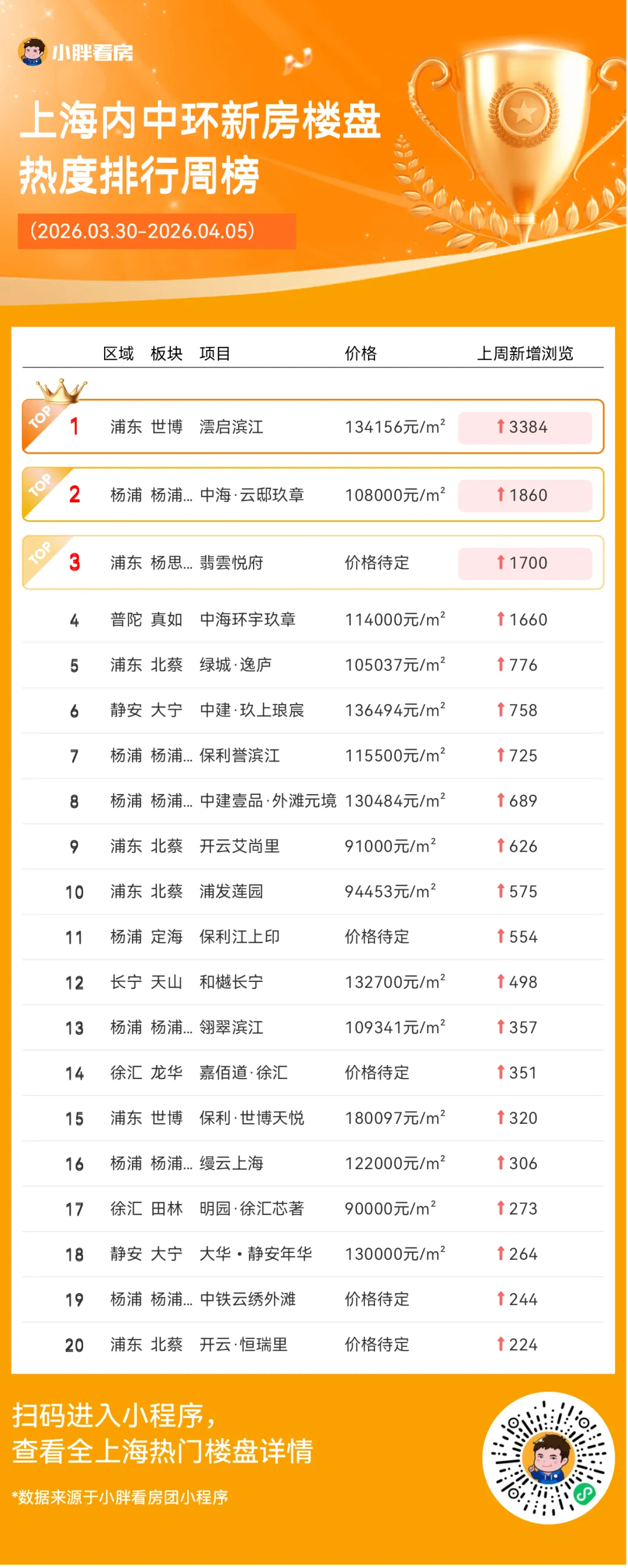 小胖看房团小程序发布一周新房热度榜单(根据新增浏览量排名),分全城榜和总价榜。看看本周谁的人气最高?你心仪的楼盘是否上榜吧~上海二手房最新成交量:昨日(4月5日)网签270套(含住宅、商业、车位等)。