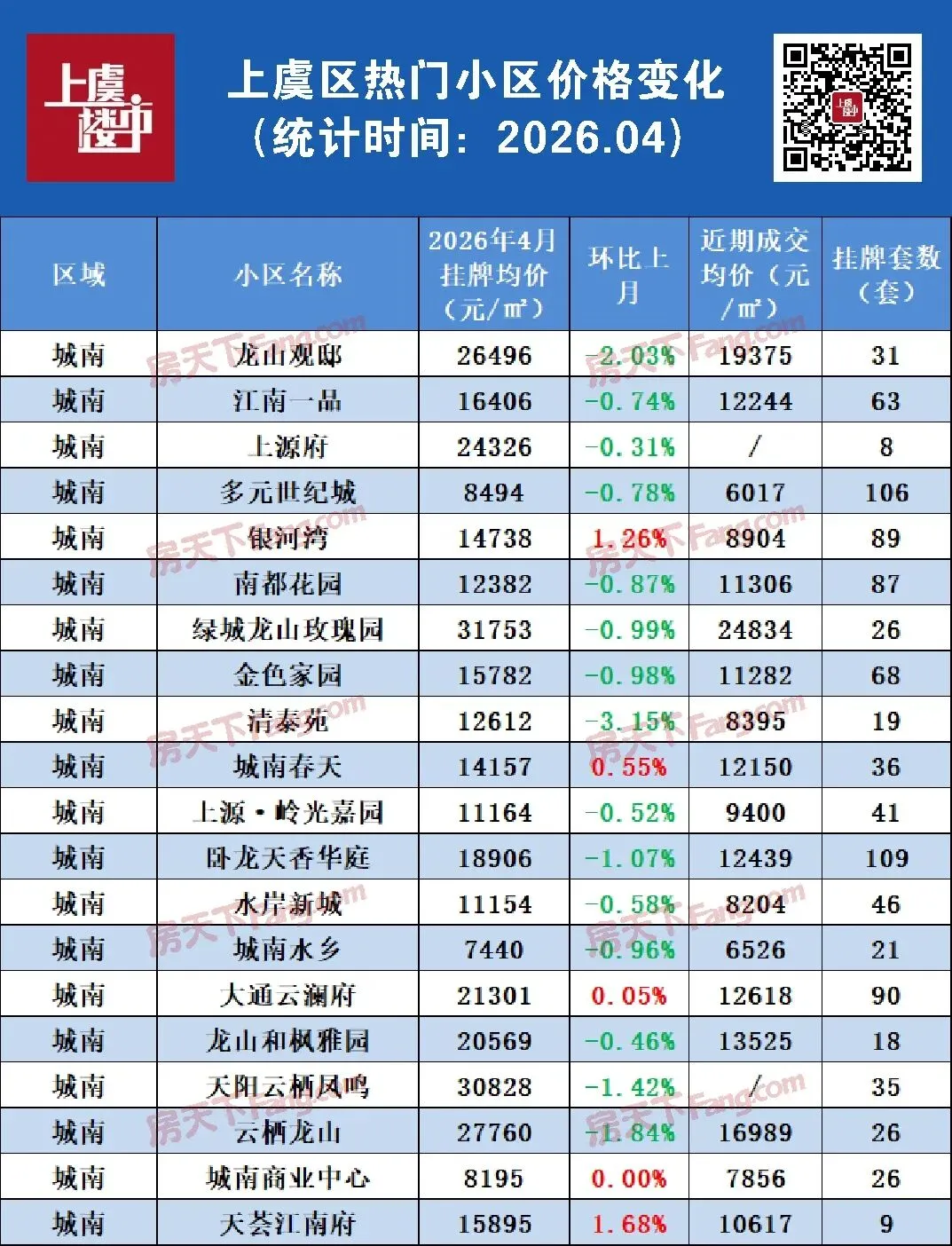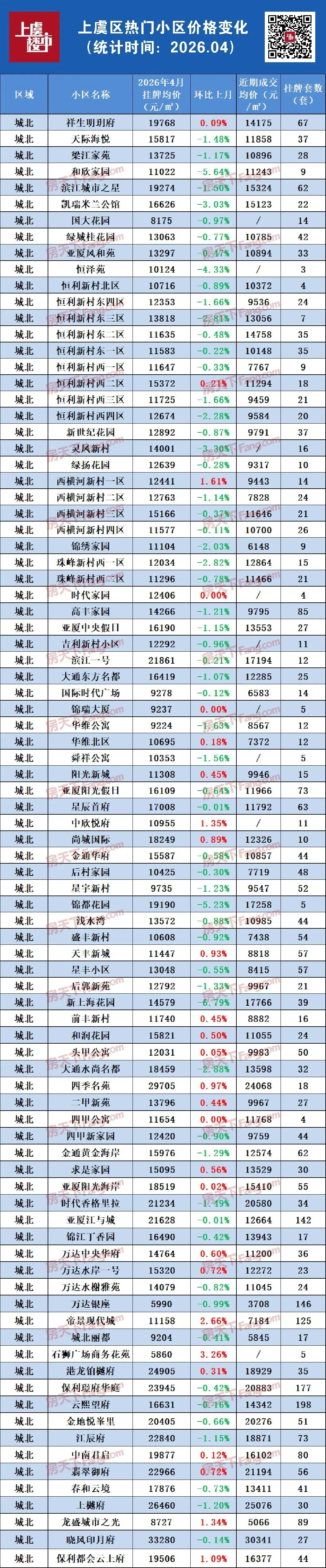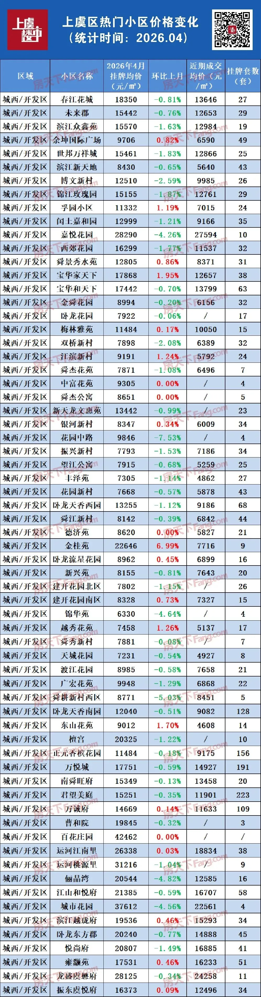 该平台上虞3月看房人数近4000人,环比增长121%,平均每天超124组购房者奔波在看房路上。这说明带看是真多了,很多观望的人看房积极了,从而促进成交。接下来,我们就来捋一捋上虞各区域楼市的二手房数据,看看真实市场情况到底如何。1.本篇数据为不完全统计,仅涉及上虞城区及部分乡镇的部分二手房小区;2.本篇数据来源于诸葛找房、贝壳找房、安居客、房天下二手房网最新综合实时数据,仅供参考;3.挂牌价均比成交价略高,且二手房成交均价会受到成交房源类型、房源套数、楼层、户型、面积、装修等因素影响,具体详情以实际为准;4.部分房源的实际成交价可能与登记数据不符,具体信息建议去实地查看。