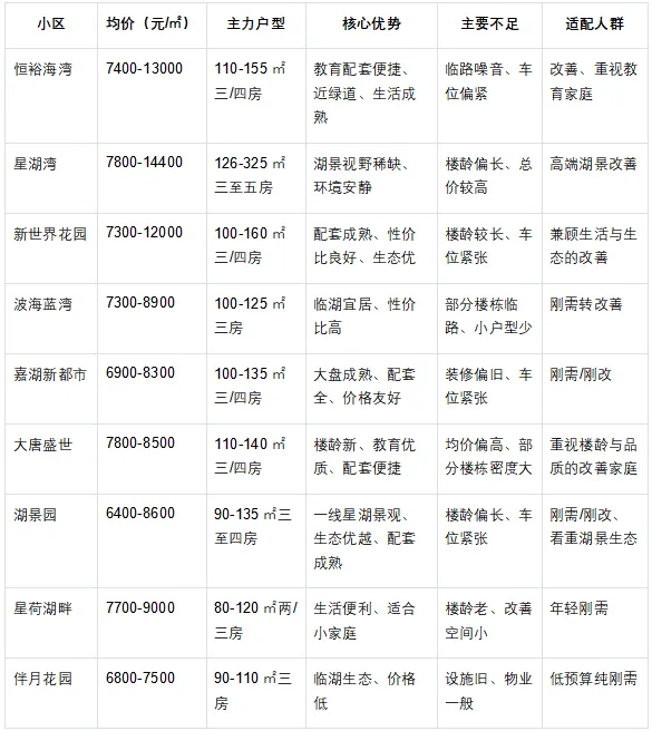 从低预算刚需上车,到追求品质的改善居住,再到看重稀缺湖景的高端置业,板块内多个热门小区可覆盖不同预算、不同家庭结构的需求。购房没有统一标准,贴合自身预算、家庭结构与生活习惯,才是更合适的选择。