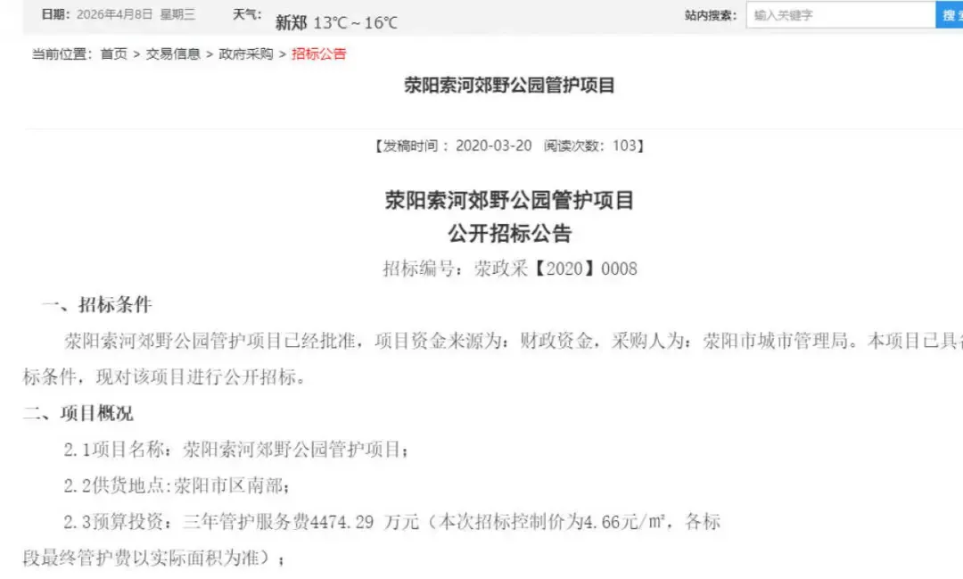 4月7日,记者在荥阳市公共资源交易平台上看到2020年3月份的一则《荥阳索河郊野公园管护项目公开招标公告》,公告中说公园的管护项目资金来源于财政资金,采购单位为荥阳市城市管理局。