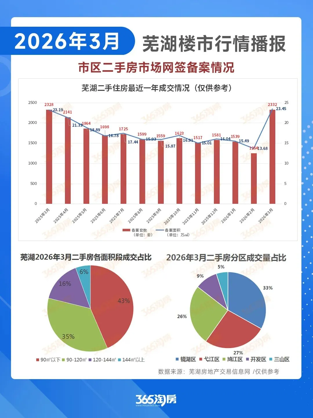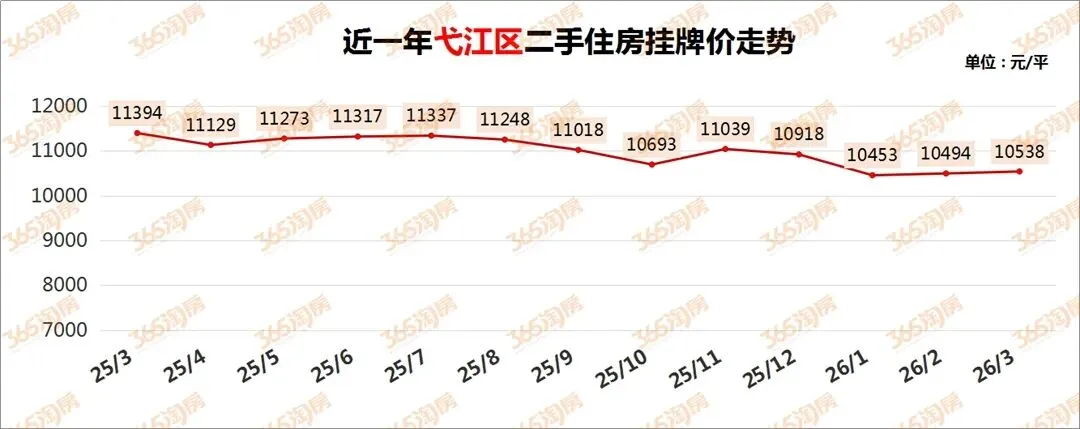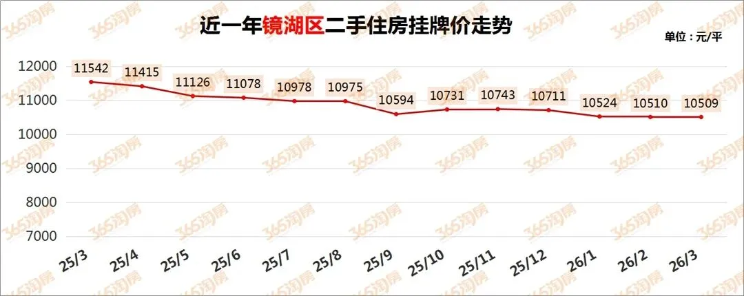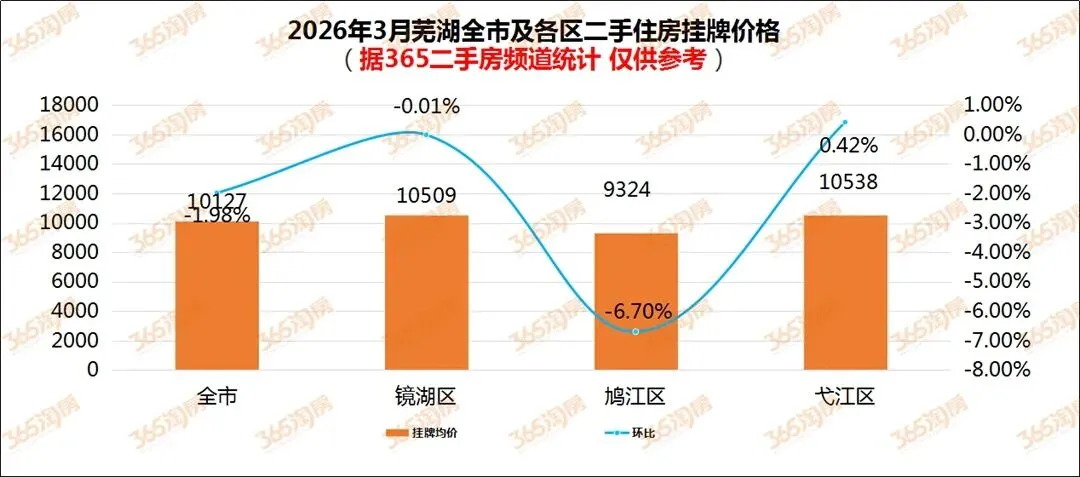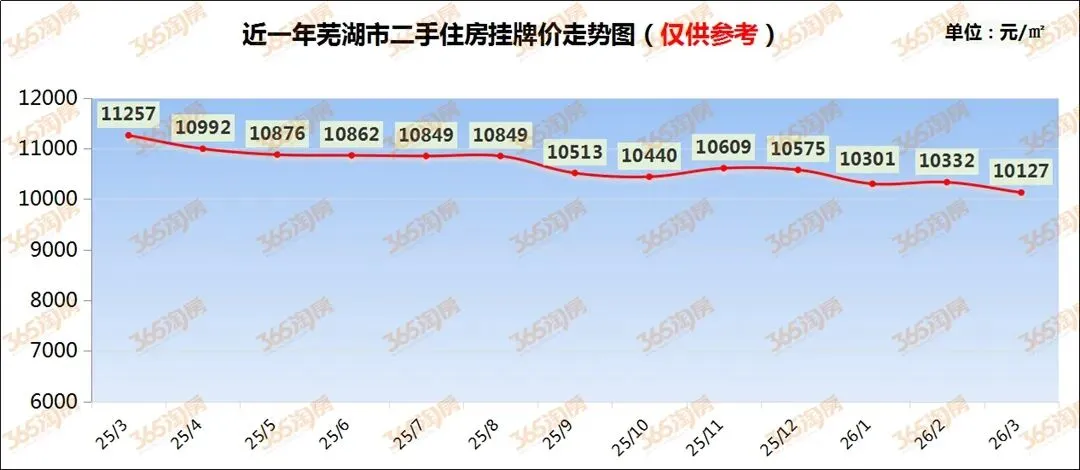 尽管成交缩量,市场挂牌价格表现则相对稳健。据365淘房数据中心统计:2026年3月芜湖市区二手住房挂牌均价为10127元/㎡,环比下降1.98%,整体价格水平略有下滑,局部呈现“以价换量”趋势。