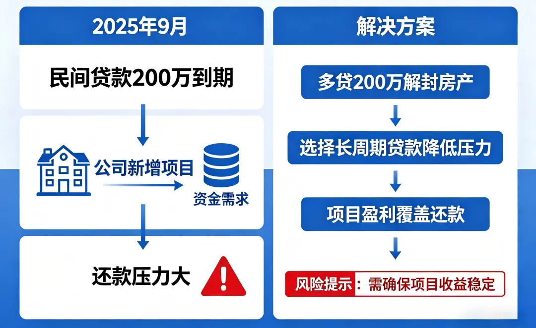 高先生2025年9月有200万民间贷款到期,因逾期未结清,房产被对方查封。他急需200万解封房产、结清欠款,同时公司新增项目也需资金,想多贷一笔周转,又担心贷款期限短、还款压力大,再次陷入查封危机。
