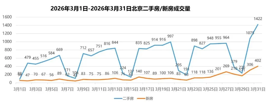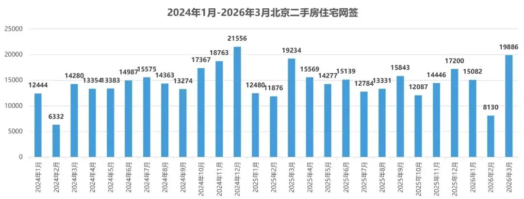 2026年3月北京二手房网签成交量达到19,886套,环比2月暴涨144.6%,同比去年3月增长3.4%。这一数字创下了近15个月以来的单月成交量最高纪录。