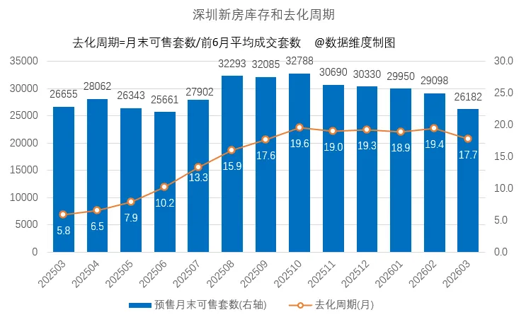 3月份10个项目拿预售,批售房源约2452套,供应量相比2025年3月减少近30%。剔除保障性住房,商品住宅批售1748套。02. 新房库存下降至2.6万套,去化周期缩短