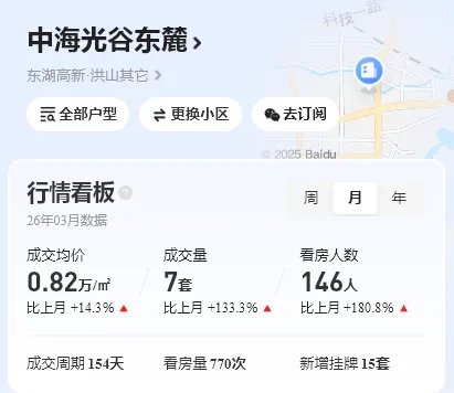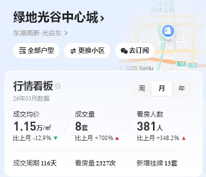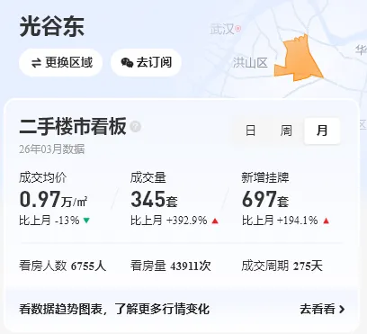 3月光谷二手房成交345套,2月份仅成交70套,环比增长393%,但是成交均价比2月份降低13%。带看量在回升,看房人数激增,光谷二手房正在稳稳的、一步一个脚印的向上走。
