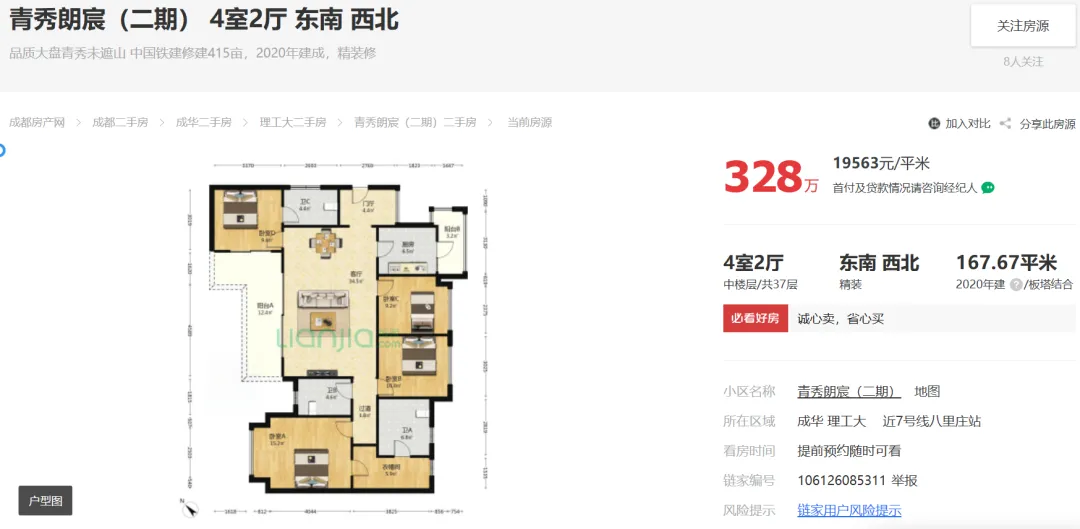 2026年04月08日,据市场端消息:成都成华理工大,青秀朗宸二期建面168平套四报价328万;目前房东心里价在328万愿意出售。