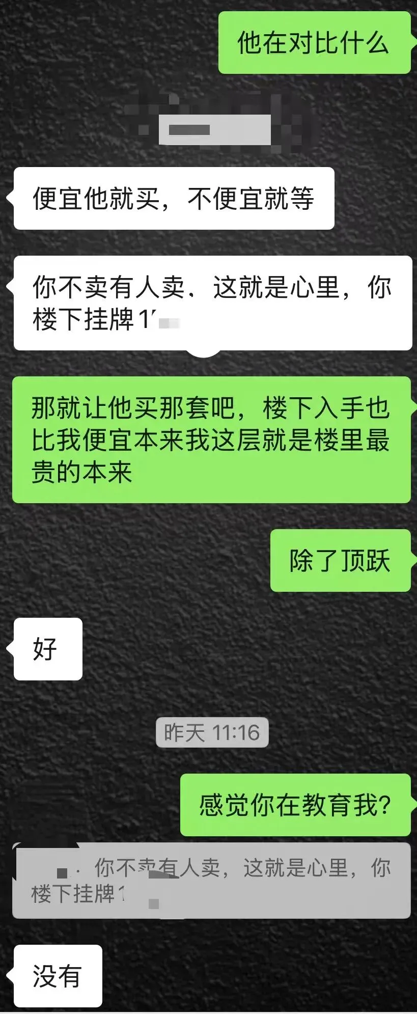前两天我报了个底价,客户方的经纪人主动联系到我,没说客户的基本情况,也没有期间看房对比信息,上来就只强调我的底价太高了,发生了下面的对话。