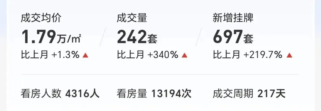 (1)本月二手房成交均价1.79万/平,环比上涨约1.3%;(注:成交均价——即统计日内,二手普通住宅的成交总价/成交总面积。)