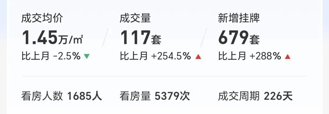 (2)本月二手房成交量117套,环比上涨约254.5%;(注:成交量——即统计日内,二手普通住宅的新增成交量。)