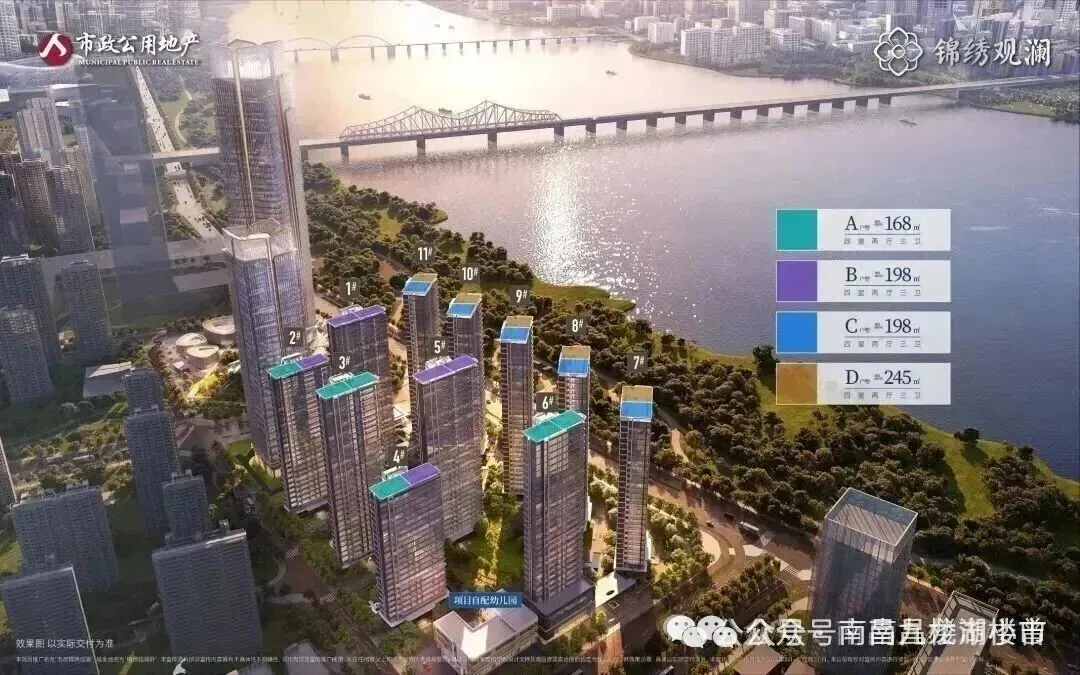 市政锦绣观澜,距离南师附小腾龙校区2.28公里,距离南昌外国语九龙湖初中1.34公里,距离地铁四号线安丰站1.2公里,位于赣江南大道以西,上饶大街以北,共11栋住宅和2栋超高层,住宅总户数642户,机动车位1881个,其中地上147个,容积率3.0,绿地率20%,面积168平,198平,238平,首开部分楼栋2026年12月交付,融政物业3.9元,小学临时过渡读南师附小腾龙校区和中学读南昌外国语学校九龙湖初中部。市政锦绣观澜由南昌市政公用集团,国企打造的楼盘。