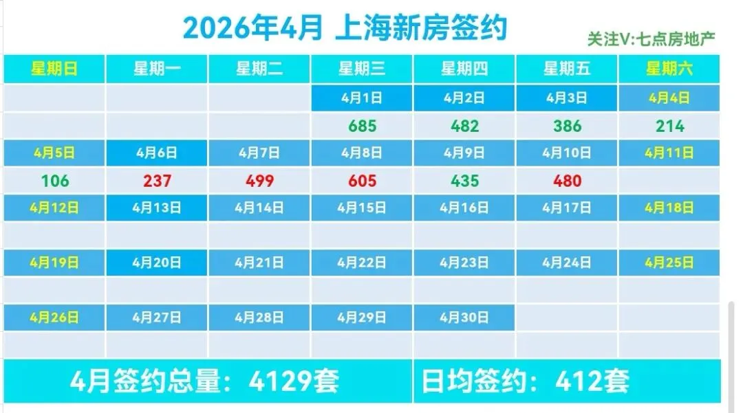🏠4月上海新房总签约4129套,日均签约412套,本月签约总面积34.46万m²,套均面积81.07m²。