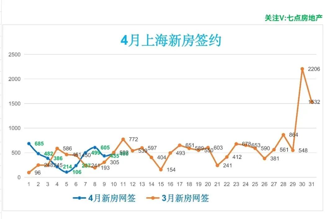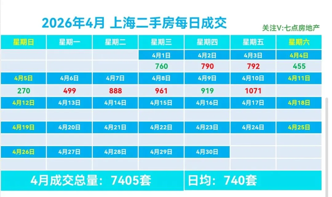 🏡4月,上海二手房成交量累计7405套,日均成交740套,较上个月日均减少266套(降幅26.44%)。