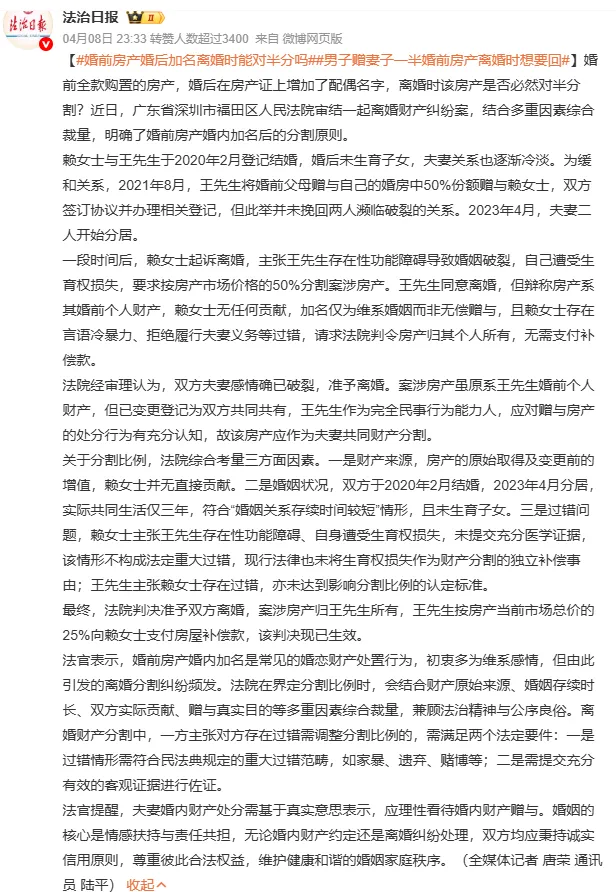 其后,赖女士起诉离婚,主张王先生存在性功能障碍导致婚姻破裂,自己遭受生育权损失,要求按房产市场价格的50%分割案涉房产。王先生同意离婚,但辩称房产系其婚前个人财产,赖女士无任何贡献,加名仅为维系婚姻而非无偿赠与,且赖女士存在言语冷暴力、拒绝履行夫妻义务等过错,请求法院判令房产归其个人所有,无需支付补偿款。