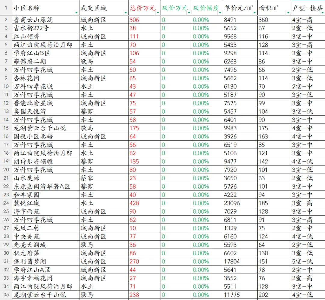 从总价维度来看,麓悦江城以428万的总价断层领跑,成为本次成交中总价最高的房源,鲁商云山原筑306万、龙湖紫云台千山悦238万、两江曲院风荷泊月邸71万、鲁能北渝星城86万紧随其后,总价TOP5中包含大户型改善盘与刚需盘,反映出不同层级的购房需求均有释放;