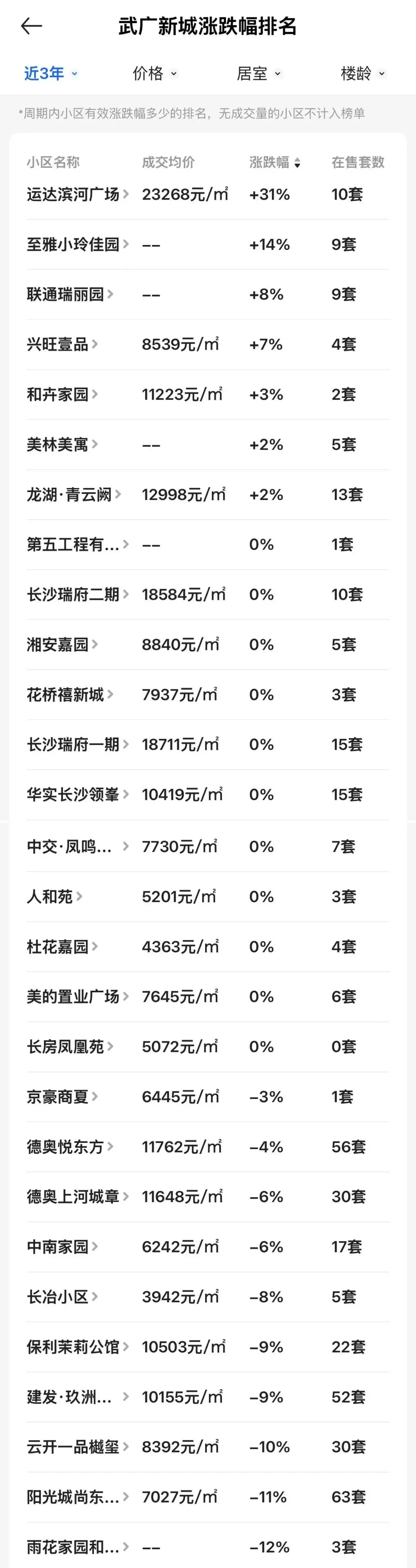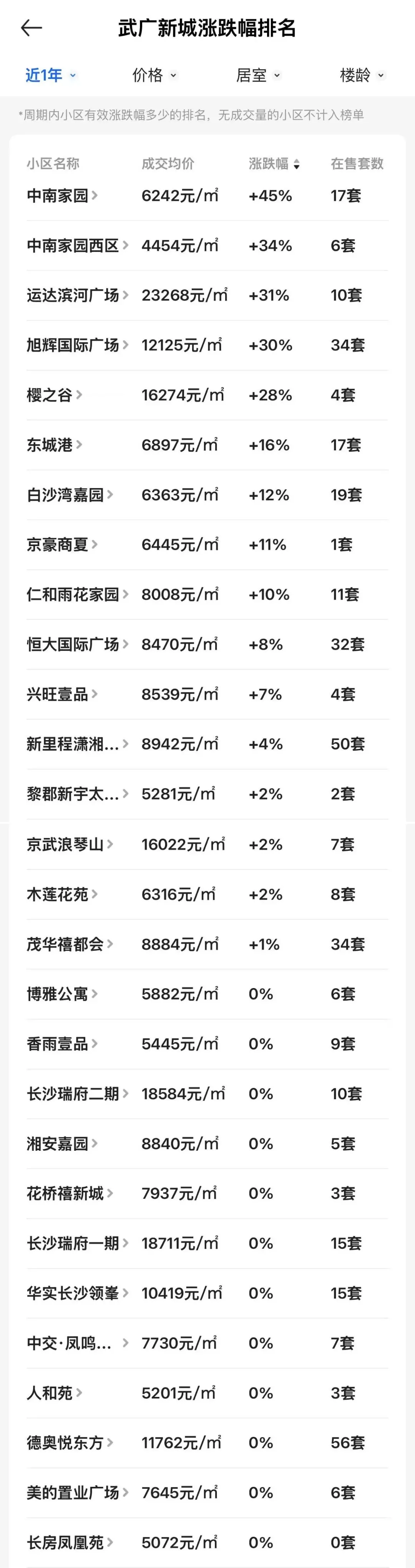 值得一提的是,武广新城竟然有16个小区的房价实现了正增长,涨幅最高的分别是:中南家园(+45%)、中南家园西区(+34%)、运达滨河广场(+31%)。