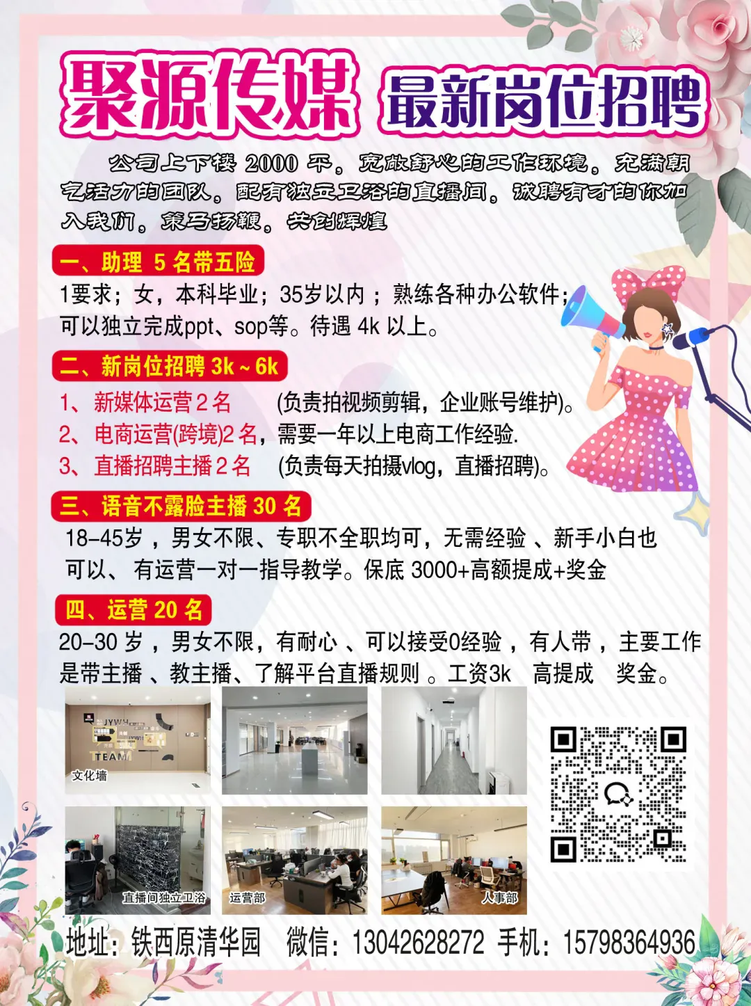 公司上下楼 2000 平,宽敞舒心的工作环境,充满朝气活力的团队,配有独立卫浴的直播间,诚聘有才的你加入我们,策马扬鞭,共创辉煌