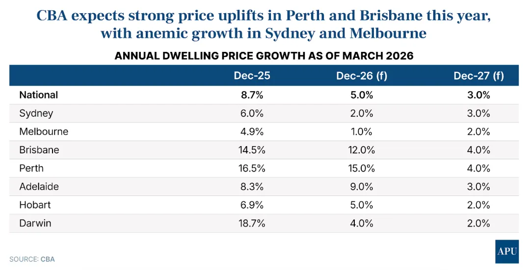 CBA和Westpac刚发布的2026房价预测,画风完全不一样。CBA说Perth今年涨15%,Brisbane涨12%——妥妥的领跑。但Sydney呢?只给了2%。Melbourne更惨——1%。再看Westpac,也说全国5%没问题,但排序完全不同。Melbourne给了4%反超Sydney的3%,Brisbane只给7%,Perth只给8%。