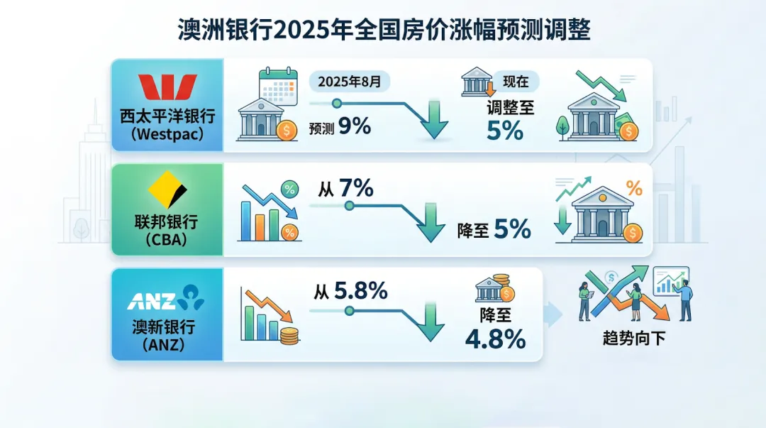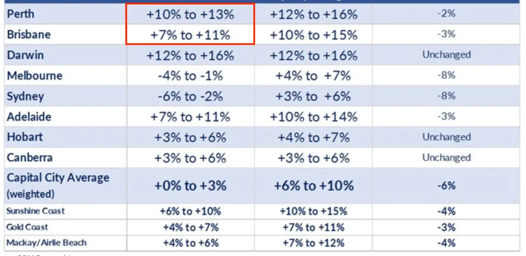 你看,Perth——一个说15%,一个说8%。差了将近一倍。Adelaide也是,9%对6%。同样的市场、同样的数据,两家银行画风完全不一样。这叫预测吗?我看更像瞎猜。