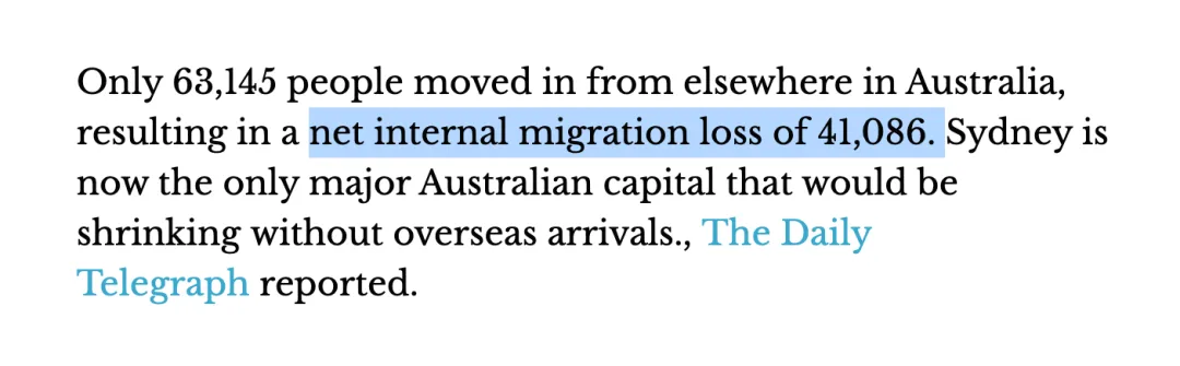 悉尼正在"漏人"。ABS(Australian Bureau of Statistics,澳洲统计局)白纸黑字的报告写的。2023到2024财年,大悉尼地区净流失了41,086个人。搬去其他州的,搬去NSW偏远地区的,加在一起——4万多人。
