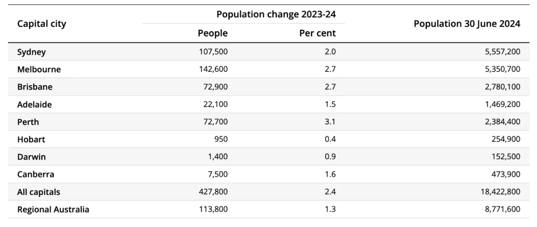 你可能会想——悉尼人都跑了,那房价是不是该跌了?诶,没那么简单。跑的是买不起房的年轻人,来的呢,是带着钱的海外移民——2023-24年光悉尼的海外净移民就超过12万。房价这东西啊,看的是谁在买,不是谁在走。人往哪去了?Perth人口增长3.1%全澳第一。Brisbane和Melbourne都是2.7%。Sydney垫底,2.0%。