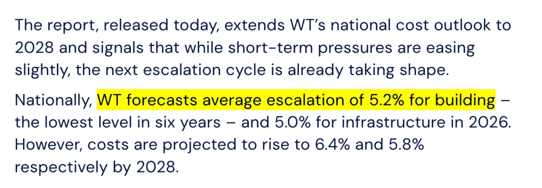 好,说回正题。RLB预测2026年建筑成本再涨4%到6%,WT Partnership说5.2%。但注意啊——这都是油价冲击之前做的预测。叠加管材暴涨和运输飙升,实际涨幅大概率要超出去。