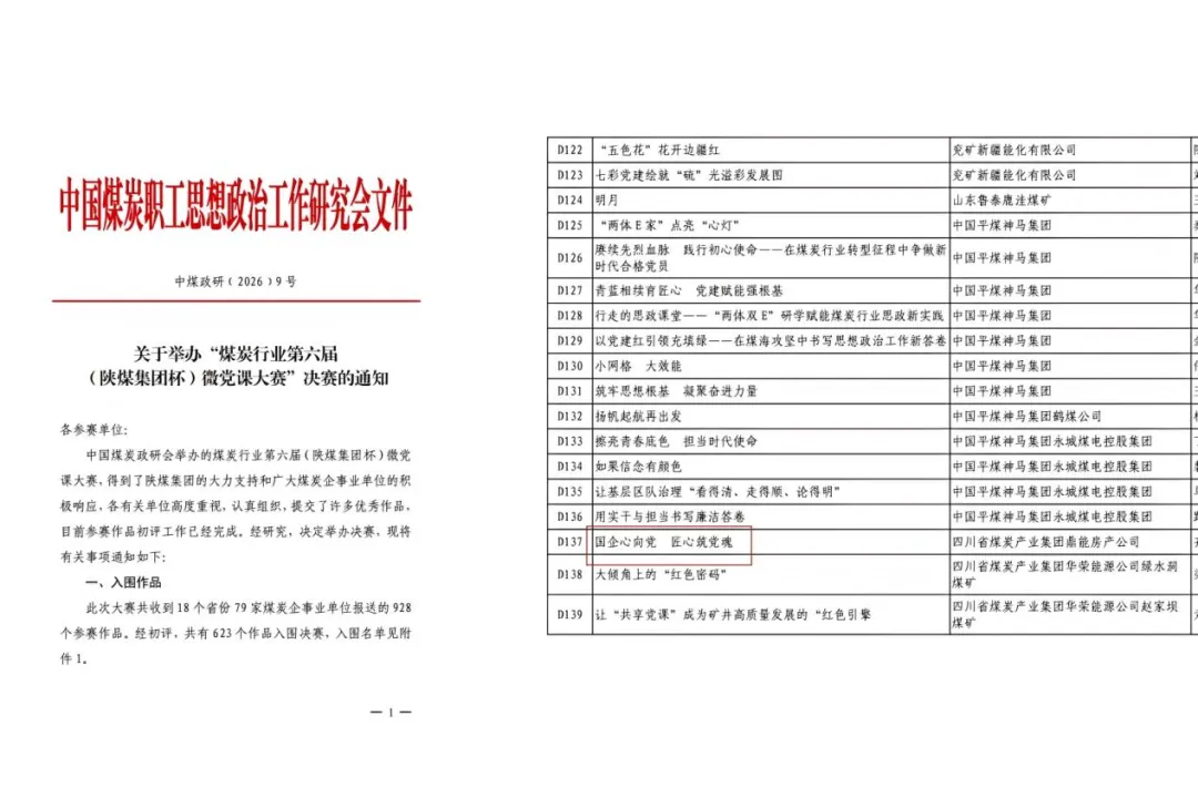 近日,从中国煤炭政研会传来喜讯,在煤炭行业第六届(陕煤集团杯)微党课大赛初评中,鼎能房产公司精心创作的微党课作品 《国企心向党,匠心筑党魂》 脱颖而出,成功入围决赛。