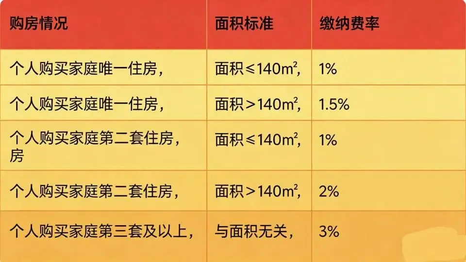 - 契税:根据首套/二套、房屋面积不同,对应不同税率