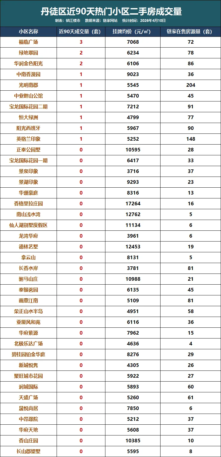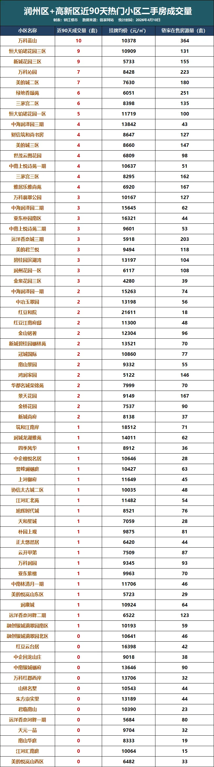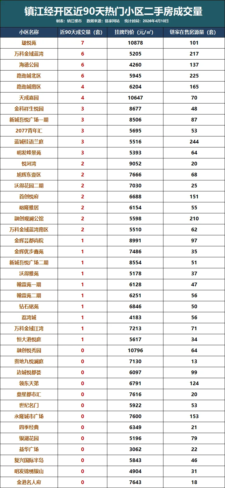 今天我们根据链家数据,统计了一份近90天镇江主城各个区域关注度较高小区的二手房成交量。