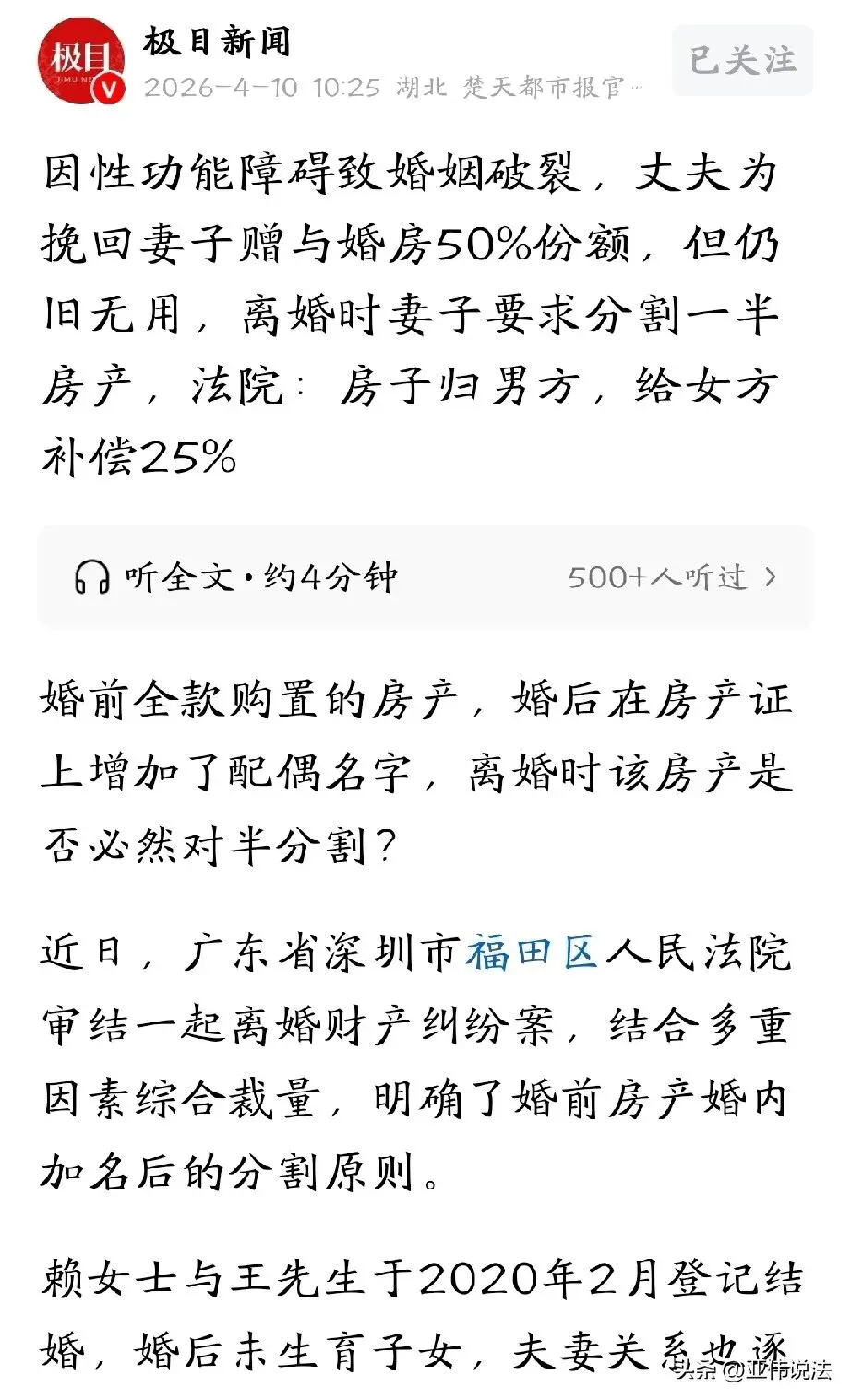 2026 年的今天,回看深圳这桩 4 年前开始的婚姻,只剩一声唏嘘。2020 年 2 月,赖女士和王先生牵手走进婚姻,谁也没想到,这场始于期待的缘分,会卡在最私密的 “缺口” 上,最后用半套房产的代价,换来了一场彻底的告别。