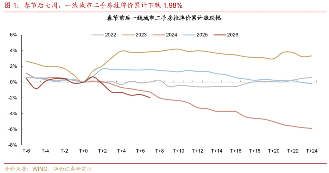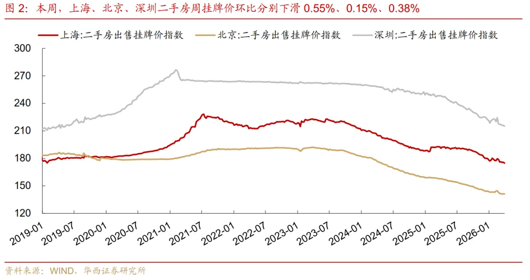 节后一线二手房挂牌价格创近年新低,房价仍处探底阶段。伴随春节后的持续震荡下跌,当前一线城市二手房挂牌价已整体回落至2017年以来的最低水平。复盘一线城市二手房挂牌价走势,其节后单周短暂冲高(涨幅0.7%),随后便迅速陷入震荡阴跌区间,目前较节后高点已累计回撤2.6%。横向对标历史同期,2026年春节后第七周的价格表现为2022年以来同期最弱,相较于2022年的企稳走平、2024年的微跌1.3%,以及2023与2025年的上涨(分别上涨3.7%与1.6%),今年下行压力相对较大。综合量价指标来看,当前房地产市场“以价换量”特征依然显著,价格端的实质性企稳或需较长时间蓄力。