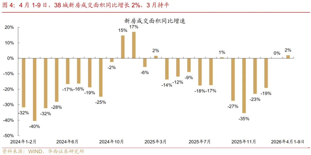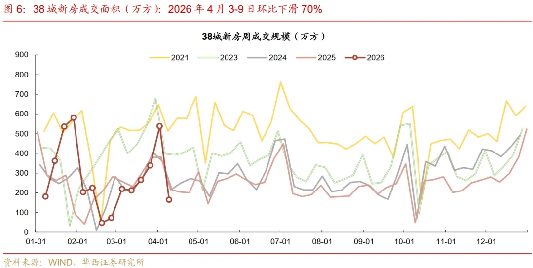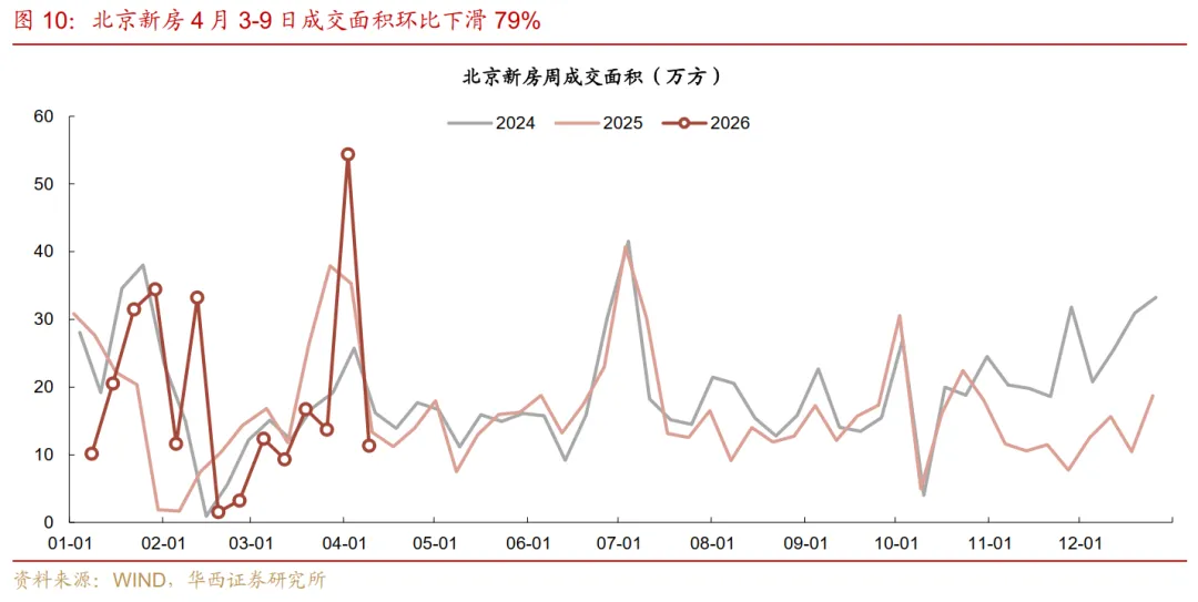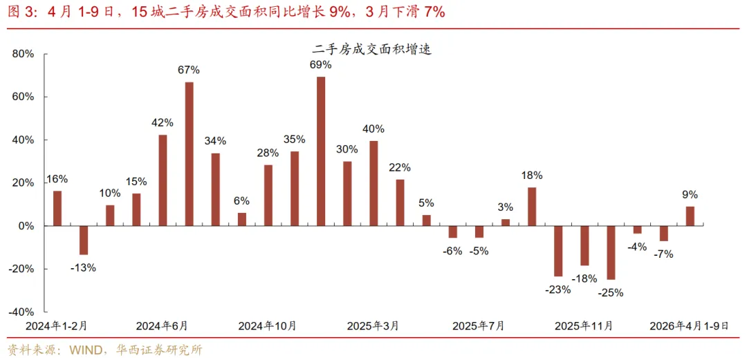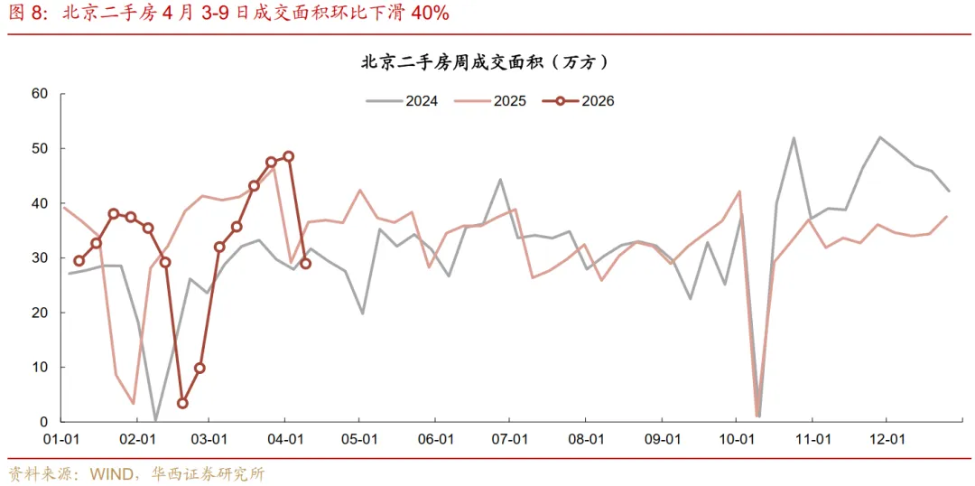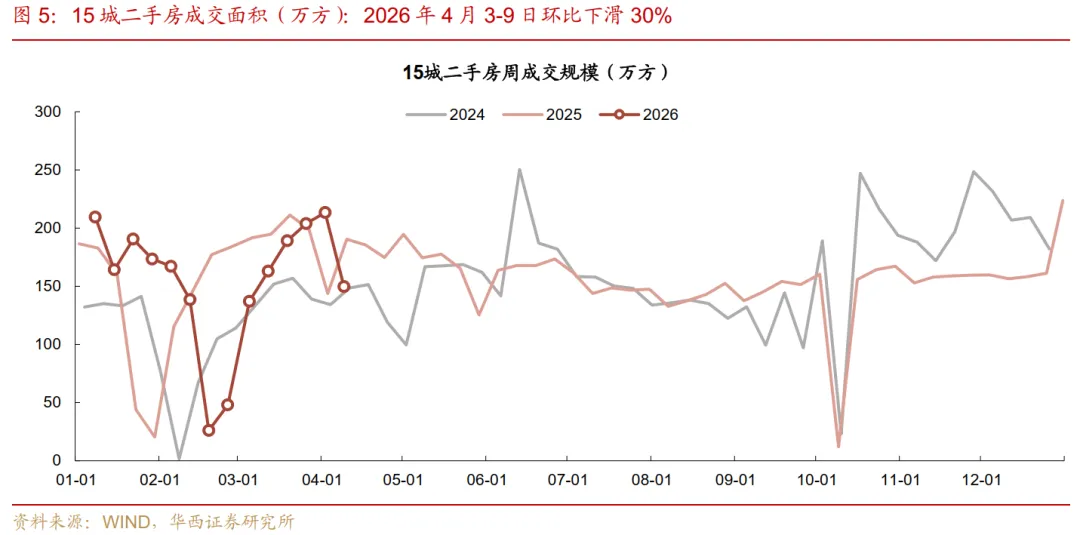 受清明假期扰动,二手房、新房周成交面积环比均出现大幅回调,整体符合季节性规律。本周新房成交面积绝对量降至164万方,低于3月周度最低水平,环比下滑70%。15城二手房在经历“六连增”后亦大幅回调,环比下滑30%至150万方,落入3月周度成交区间低位。复盘2024、2025年清明假期数据,15城二手房与38城新房当周环比回落均值分别约为33%与60%。综合来看,本周二手房环比回撤幅度与历史均值基本一致;新房因前一周的高基数效应,降幅略偏大,但总体均属正常的节假季节性扰动范畴。