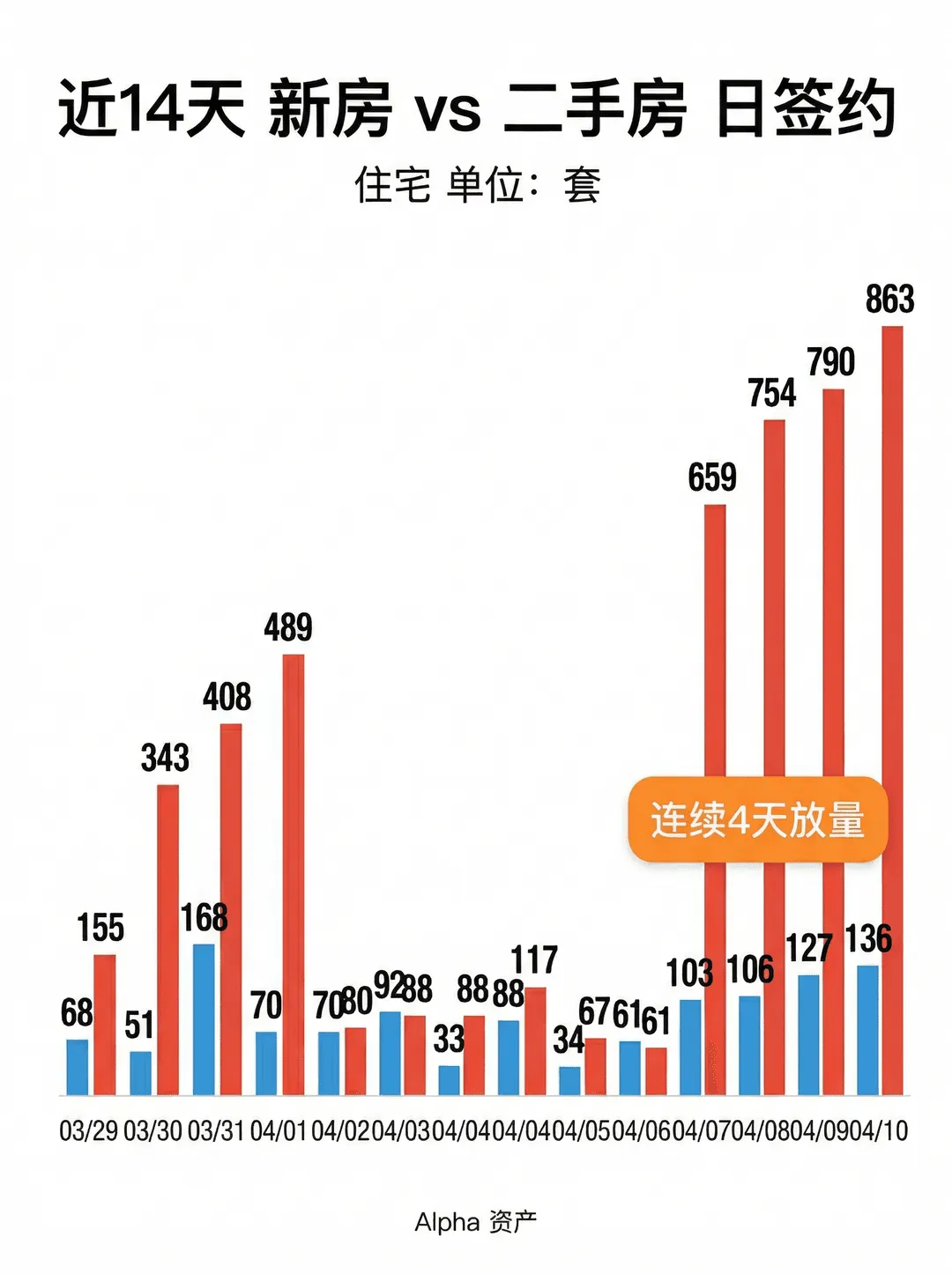 把14天数据放一起看,二手房在 4/7 之后那一截直接拉起来——从60-100 套区间跳到了659-863套区间,差了 10 倍。新房整体稳定在30-170之间。这是 30 天里最明显的一次结构变化。