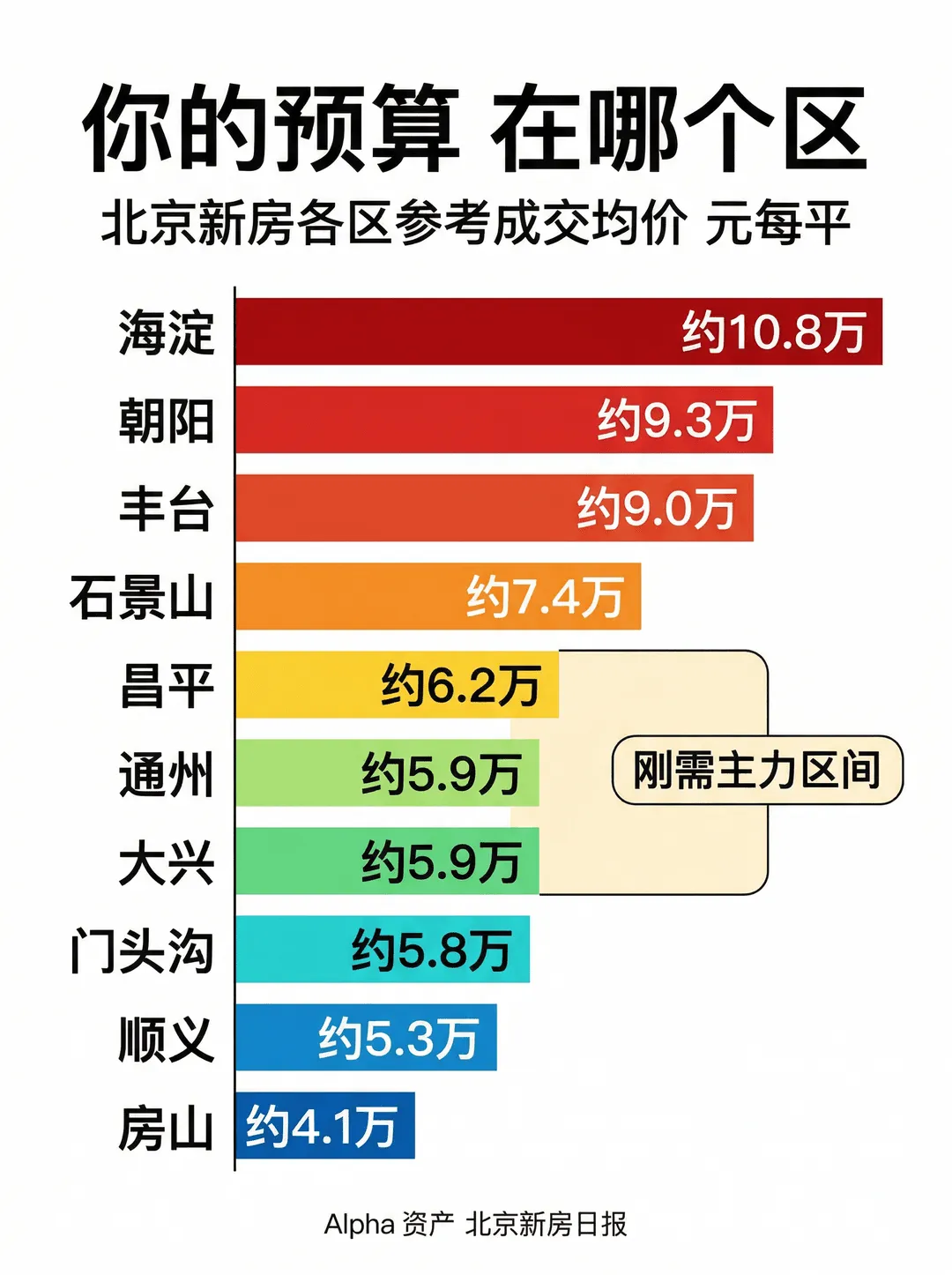 均价梯度清晰:海淀 10.8 万/㎡(最高)→ 朝阳 9.3 → 丰台 9.0 → 石景山 7.4 → 昌平 6.2 → 通州/大兴 5.9 → 门头沟 5.8 → 顺义 5.3 → 房山 4.1(最低)