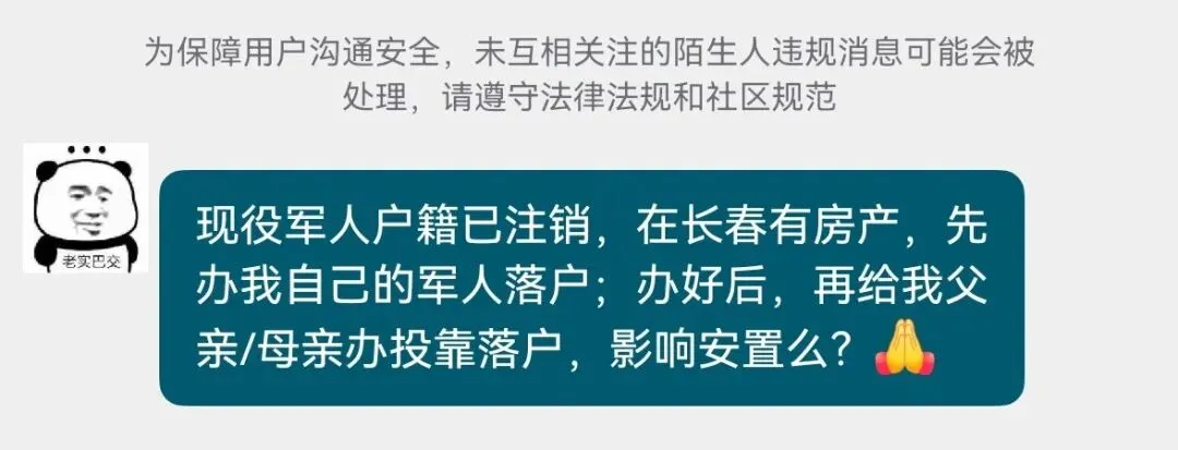 现役军人户籍已注销,在长春有房产,先办我自己的军人落户;办好后,再给我父亲/母亲办投靠落户,影响安置么?