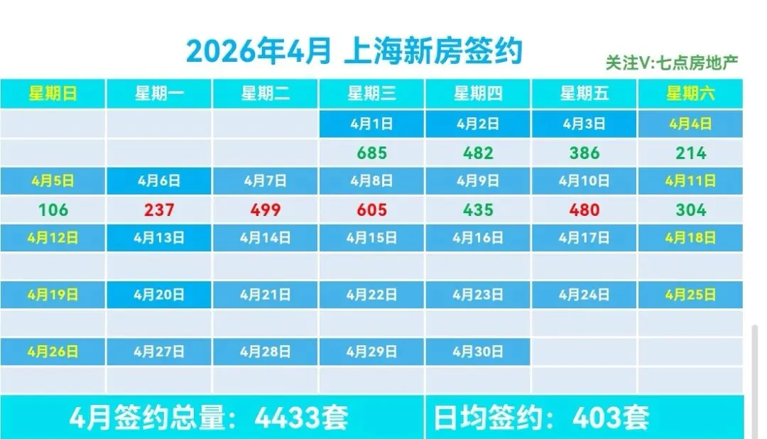 🏠4月上海新房总签约4433套,日均签约403套,本月签约总面积36.94万m²,套均面积81.12m²。