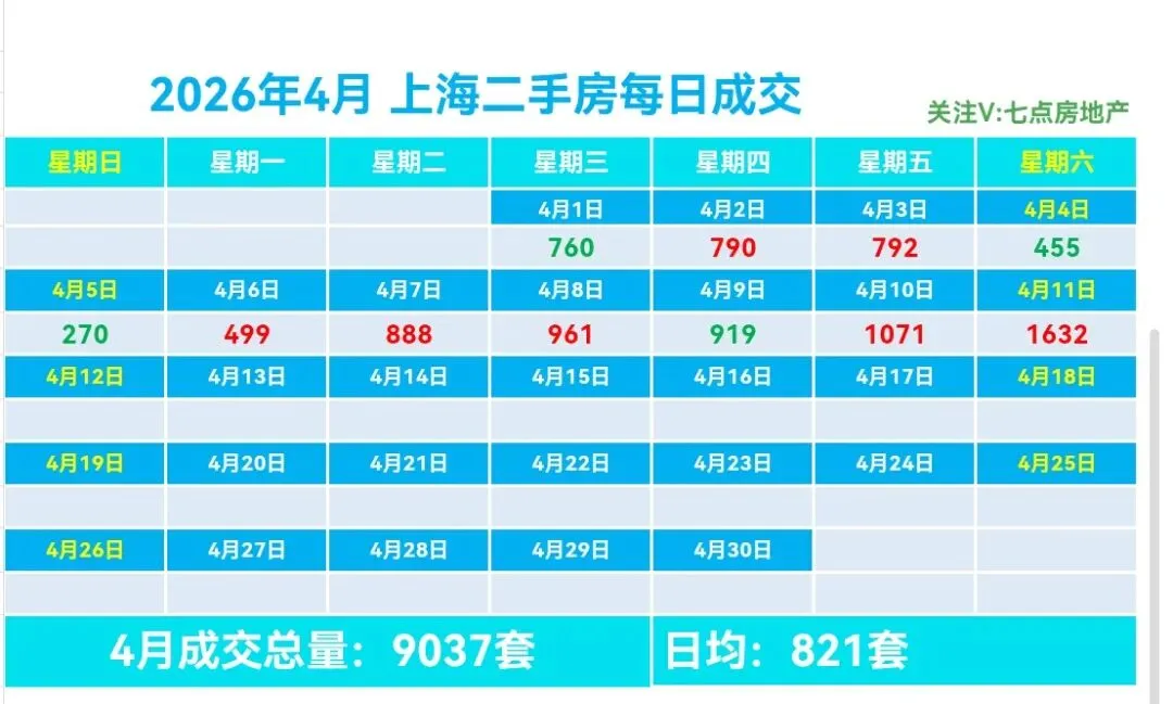 🏡4月,上海二手房成交量累计9037套,日均成交821套,较上个月日均减少185套(降幅18.39%)。