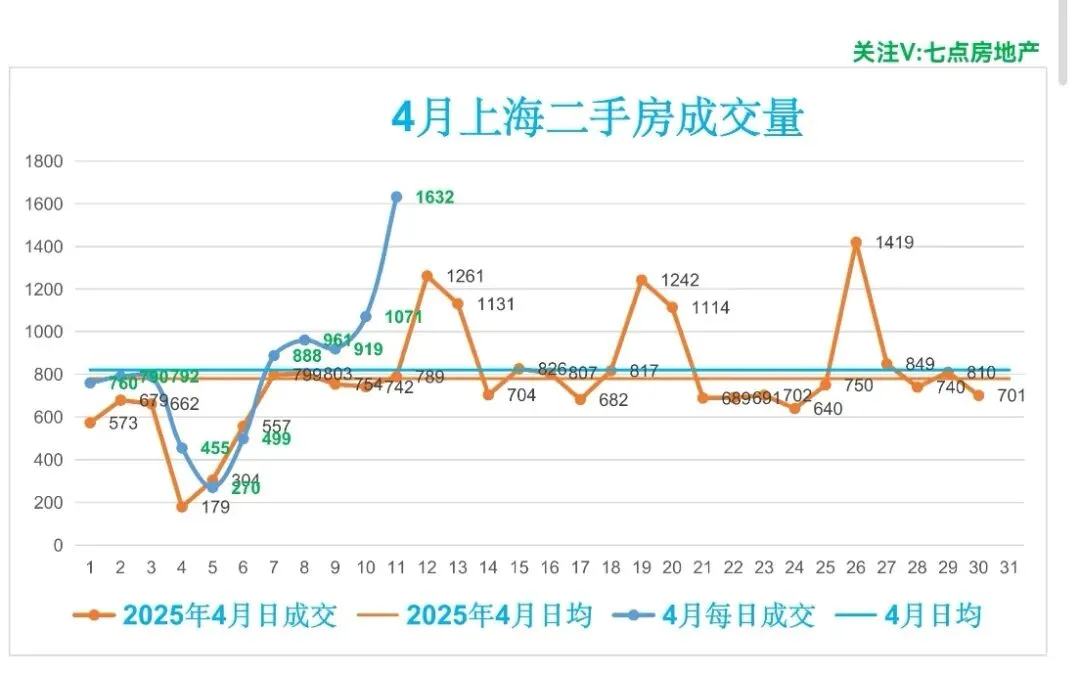🏡昨日(4月11日,周六),上海二手房成交1632套,较前一日增加561套(增幅52.38%),成交面积128418.15m²,套均面积78.69m²。