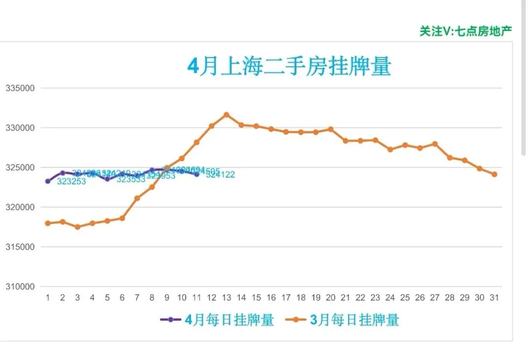 🏠昨日(4月11日,周六)挂牌324122笔,较前一日减少383笔,日均挂牌324139笔,约32.41万笔,挂牌与实际成交比394:1,去化周期约13.2个月。