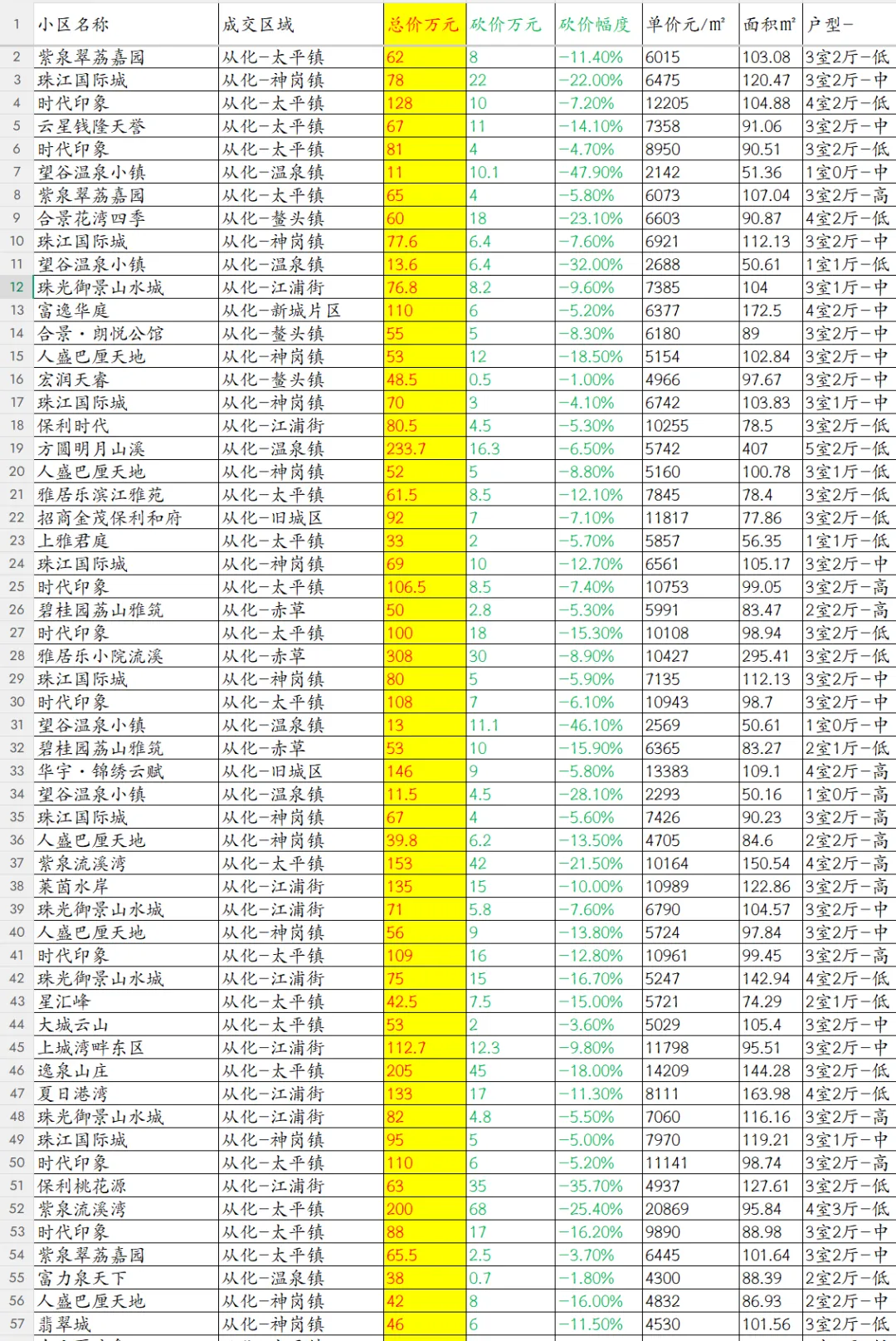 数据详情请查看图片,其中总价代表真实成交价,砍价万元+总价万元=挂牌价。