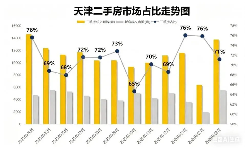 即便依旧坐稳天津楼市的“主力席位”,3月二手房成交套数仍是新房的2.5倍(同期新房成交5582套),但一个不容忽视的信号已经出现:二手房的市场份额,正在被新房悄然蚕食。