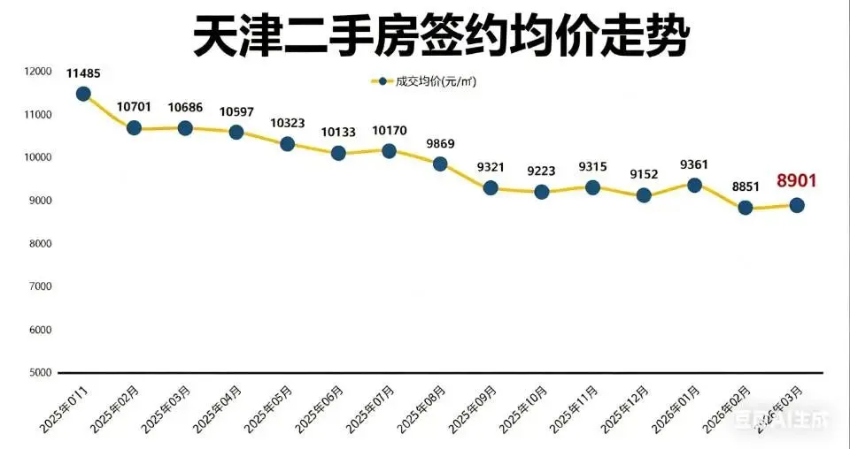 3月天津全市二手房签约均价为8901元/平米,环比小幅上涨0.6%,迎来了近年来难得的价格回暖,可对比去年同期,均价依旧下跌了17%,价格修复之路依旧漫长。