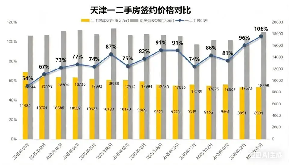 而与新房价格放在一起,二手房的价格劣势被无限放大,二者的价差堪称惊人。3月天津新房成交均价达到18298元/平米,二手房均价仅8901元/平米,一二手房价差直接拉大至106%,新房均价几乎是二手房的两倍。