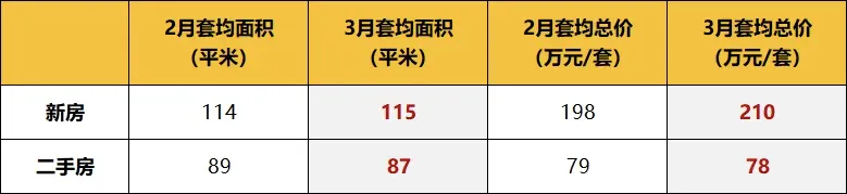 从成交数据更能看清两类市场的差异:二手房套均价仅78万/套,环比再降1万,套均面积也从89平米缩减至87平米,朝着“小面积、低总价”持续靠拢;而新房套均价从2月的198万/套上涨至210万/套,套均面积增至115平米,呈现出“越卖越大、越卖越贵”的走势,二者完全是不同的市场逻辑。
