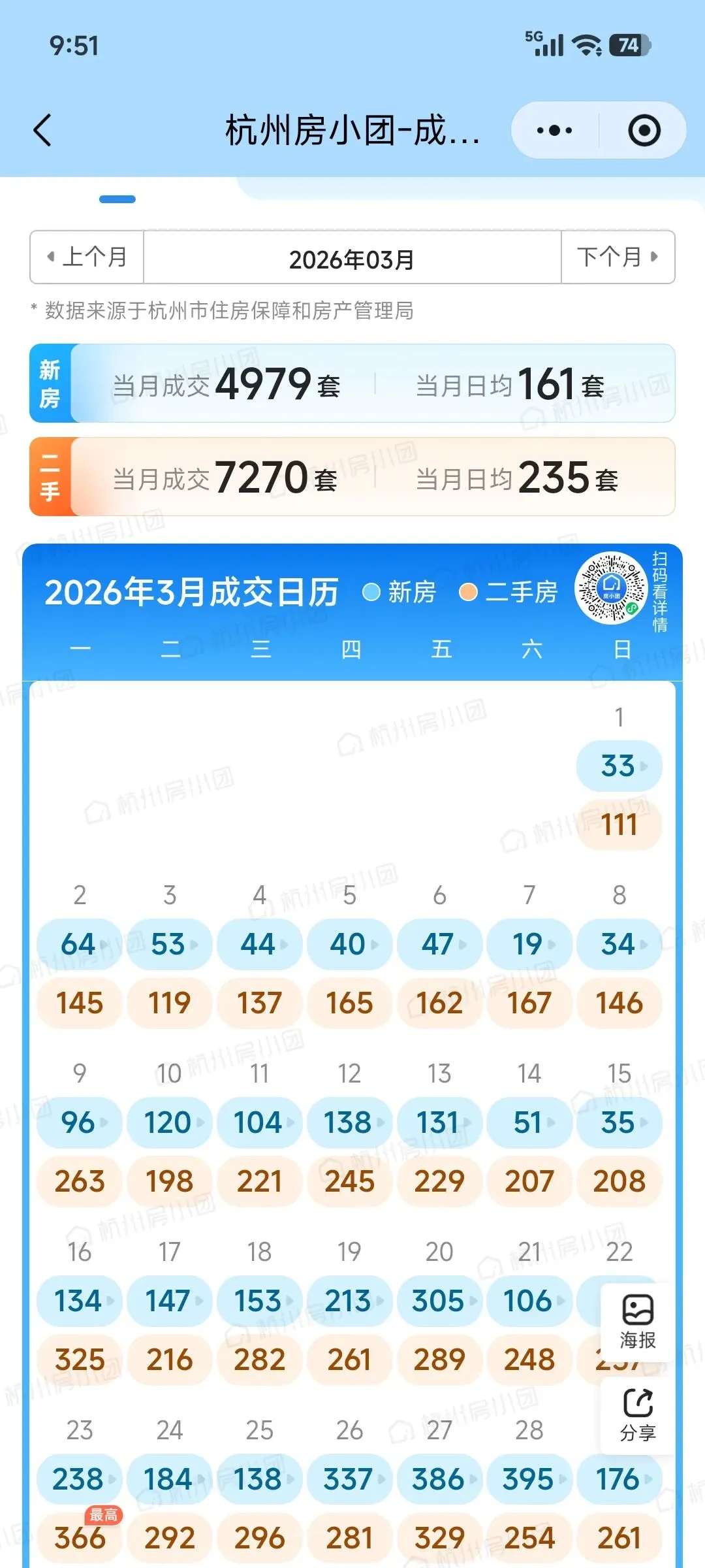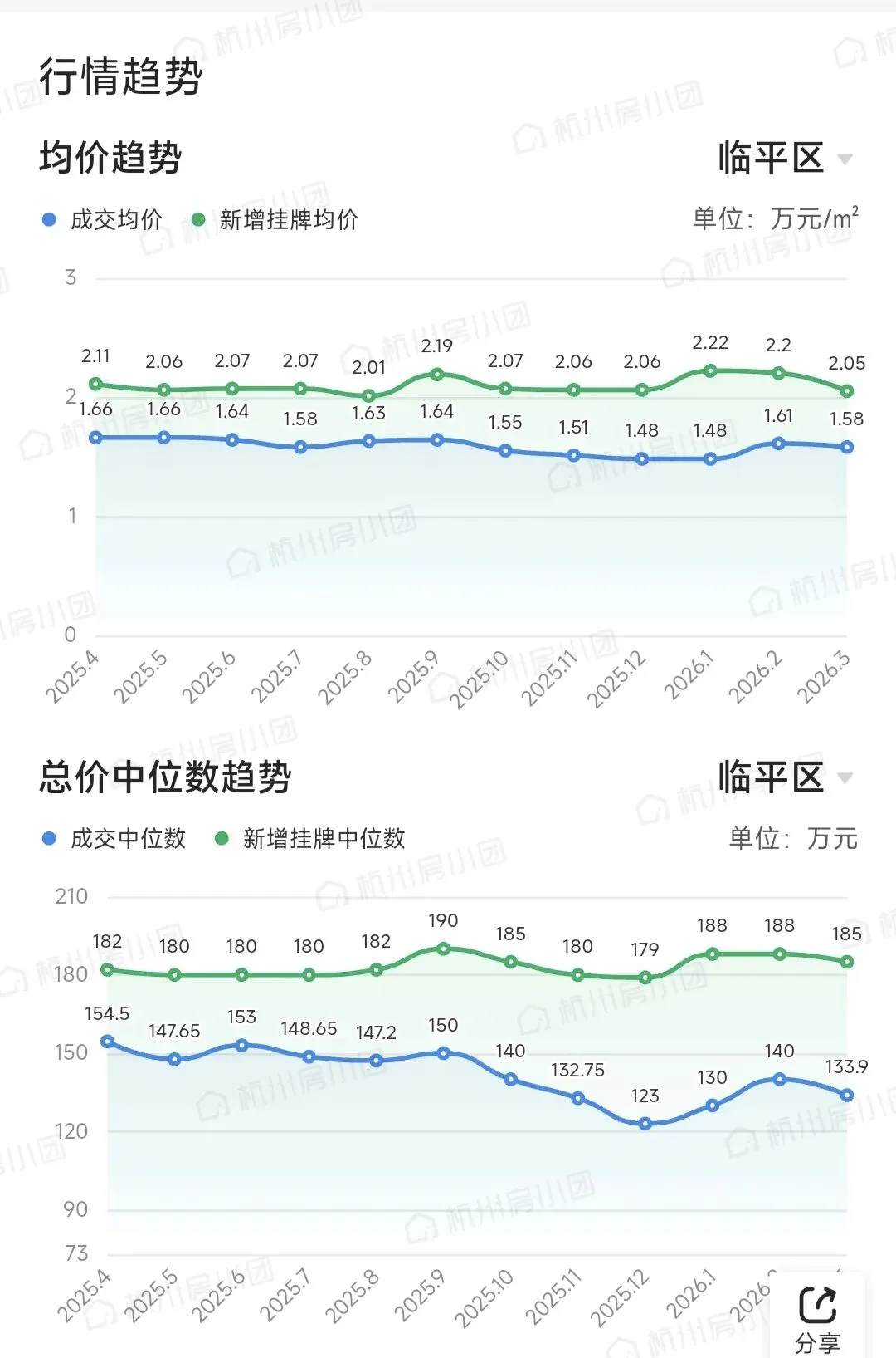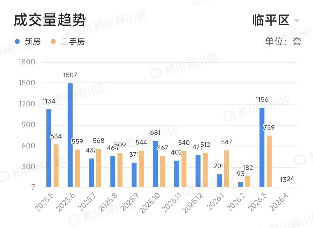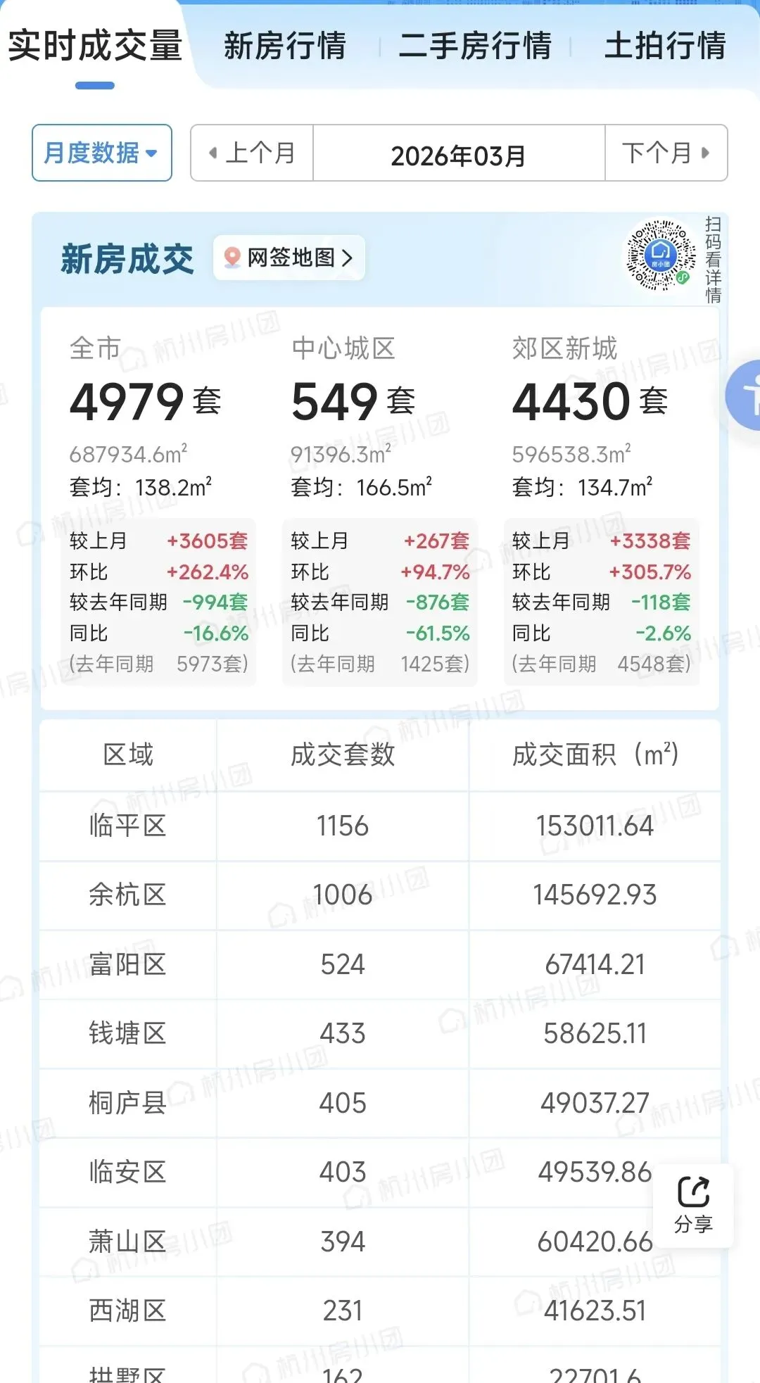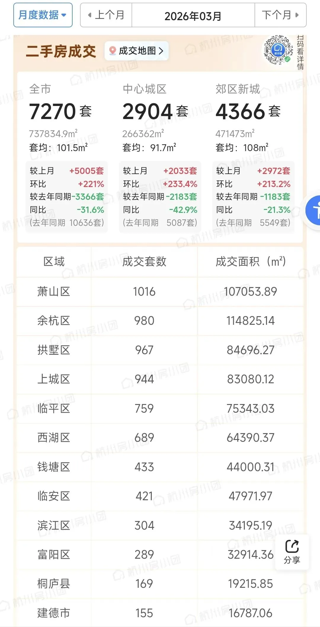 2026年3月杭州房产成交数据已出,二手成交7270套,新房成交4979套,从整个杭州市看环比上月二手房221%,新房262.4%;环比去年同期二手房-31.6%,新房-16.6%。临平二手房成交量排前五,新房成交量位居首位。 以下分布图可以看出上半年,总价100万以下-200万的买房朋友有58.36%;户型2房-3房需求的朋友占了72.97%;60.93%的朋友会选择面积50方-110方。从这三维度的数值可以看出,刚需买房朋友在成交量上占了大部分。 临平3月份二手成交量759套,新房成交1156套,成交量10套以上的小区分别是金都夏宫、华元欢乐城、景瑞阳光城法兰公园、复地连城国际、旭辉府。