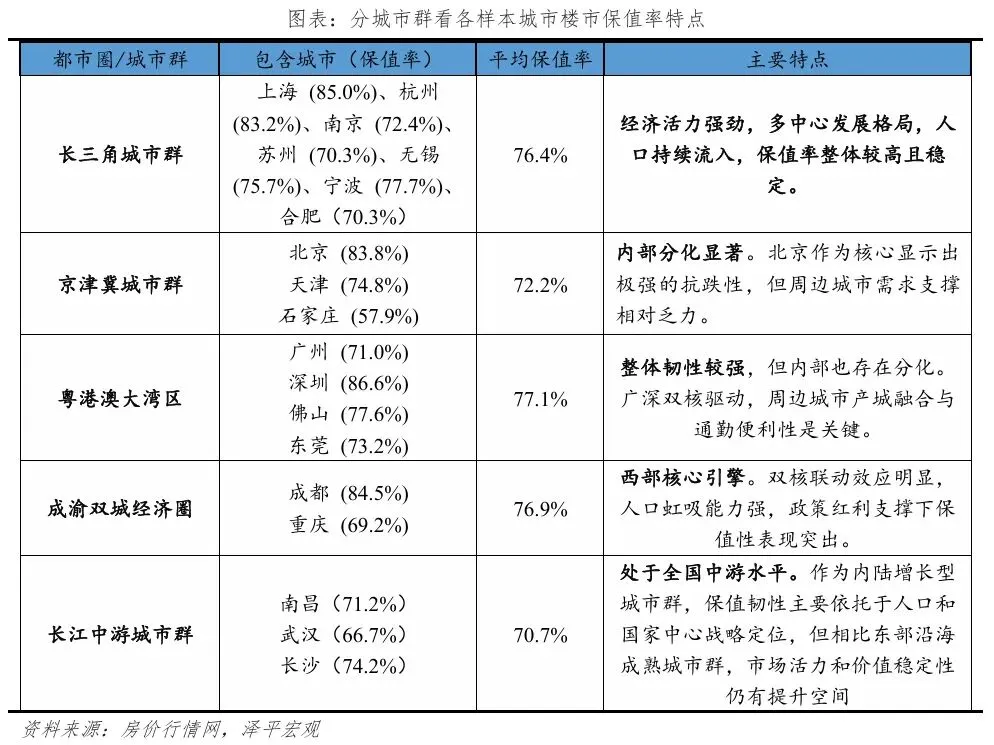 • 粤港澳大湾区、长三角、成渝经济圈平均保值率超76%,人口与产业支撑强劲。