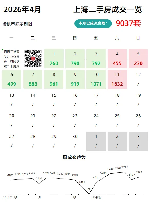 昨日(4月11日),上海二手房合计网签1632套(含住宅、商业、车位等)。最终4月累计成交9037套!