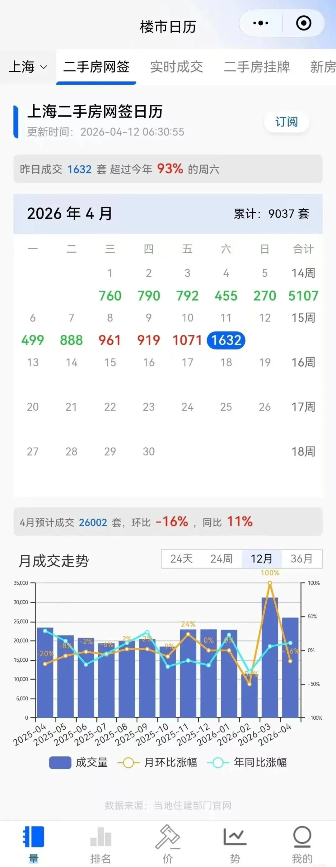 昨天(4月11日),上海二手房单日网签量冲到了1632套,再次刷新了近几年的单日纪录。 数据不会骗人——截至当天,上海4月二手房累计网签已达9037套(含住宅、商办及车位等)。按照这个节奏,“银四”的成色比所有人想象的都要猛。