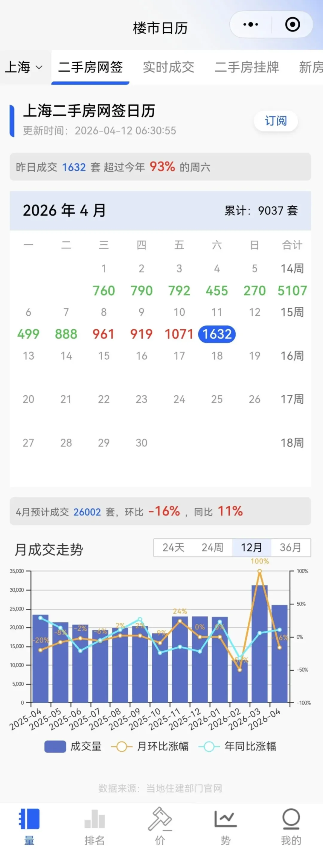 而4月11日的1632套,则把这一波行情推向了新的高度。截至4月11日,上海4月二手房已累计成交9037套(含住宅、商办及车位等)。按照这一节奏,4月总成交量有望继续保持在较高水平。